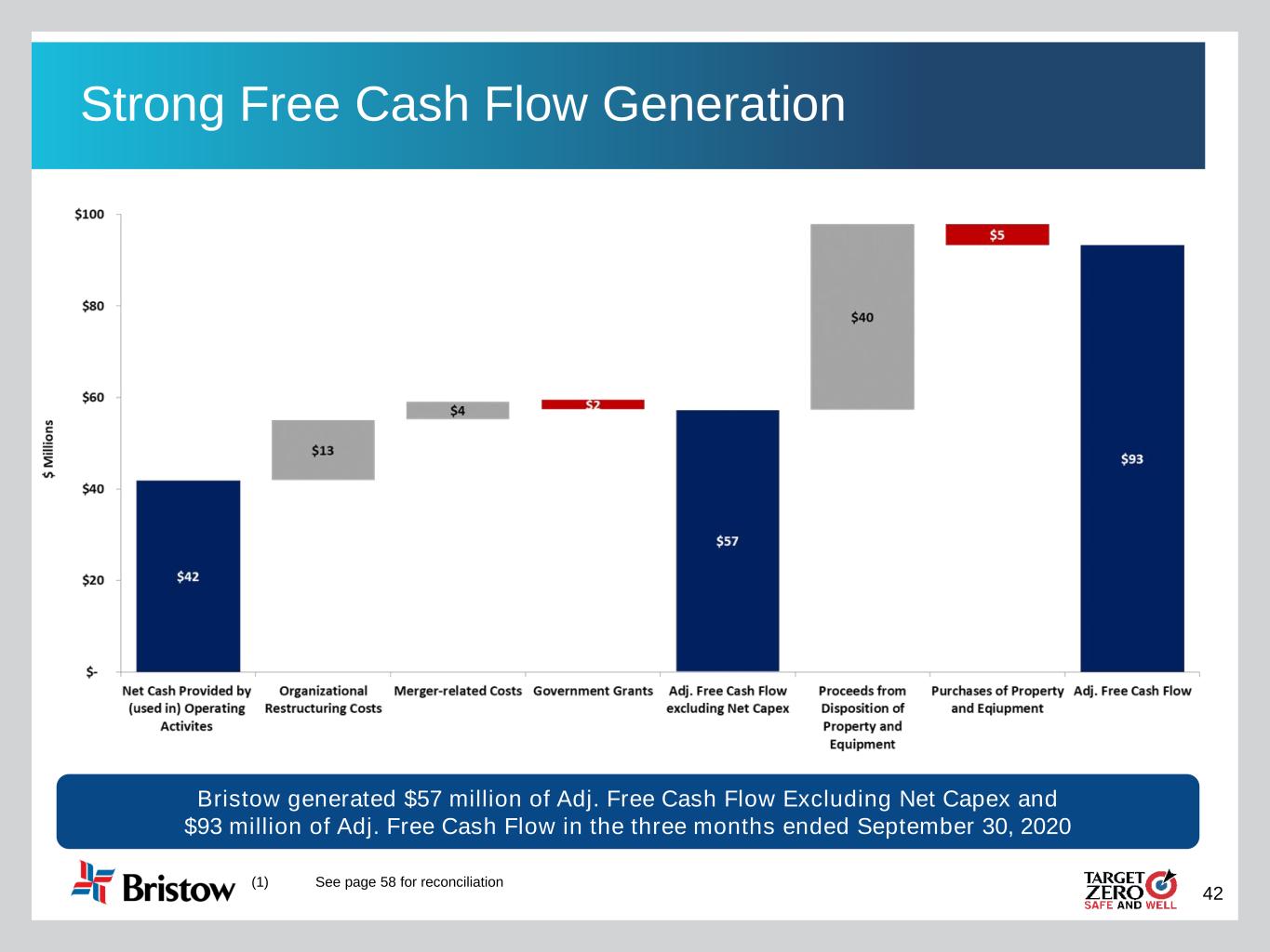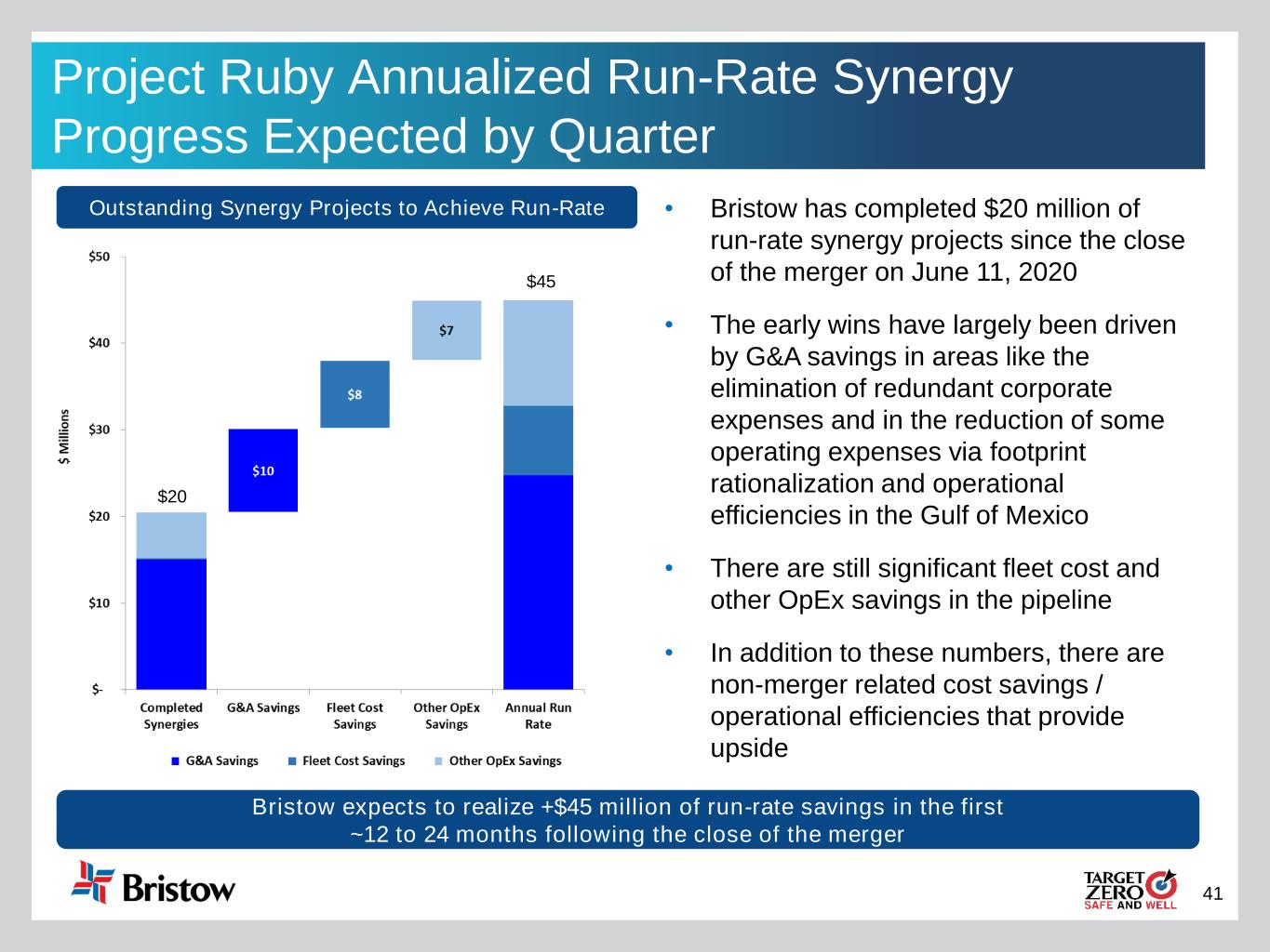 41 Project Ruby Annualized Run-Rate Synergy Progress Expected by Quarter • Bristow has completed $20 million of run-rate synergy projects since the close of the merger on June 11, 2020 • The early wins have largely been driven by G&A savings in areas like the elimination of redundant corporate expenses and in the reduction of some operating expenses via footprint rationalization and operational efficiencies in the Gulf of Mexico • There are still significant fleet cost and other OpEx savings in the pipeline • In addition to these numbers, there are non-merger related cost savings / operational efficiencies that provide upside Bristow expects to realize +$45 million of run-rate savings in the first ~12 to 24 months following the close of the merger Outstanding Synergy Projects to Achieve Run-Rate $20 $45