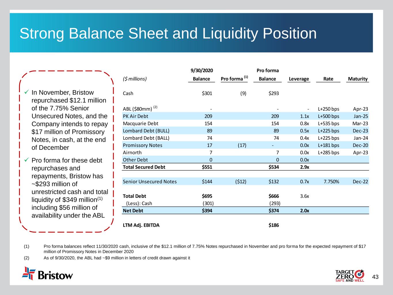 42 Strong Free Cash Flow Generation Bristow generated $57 million of Adj. Free Cash Flow Excluding Net Capex and $93 million of Adj. Free Cash Flow in the three months ended September 30, 2020 (1) See page 58 for reconciliation