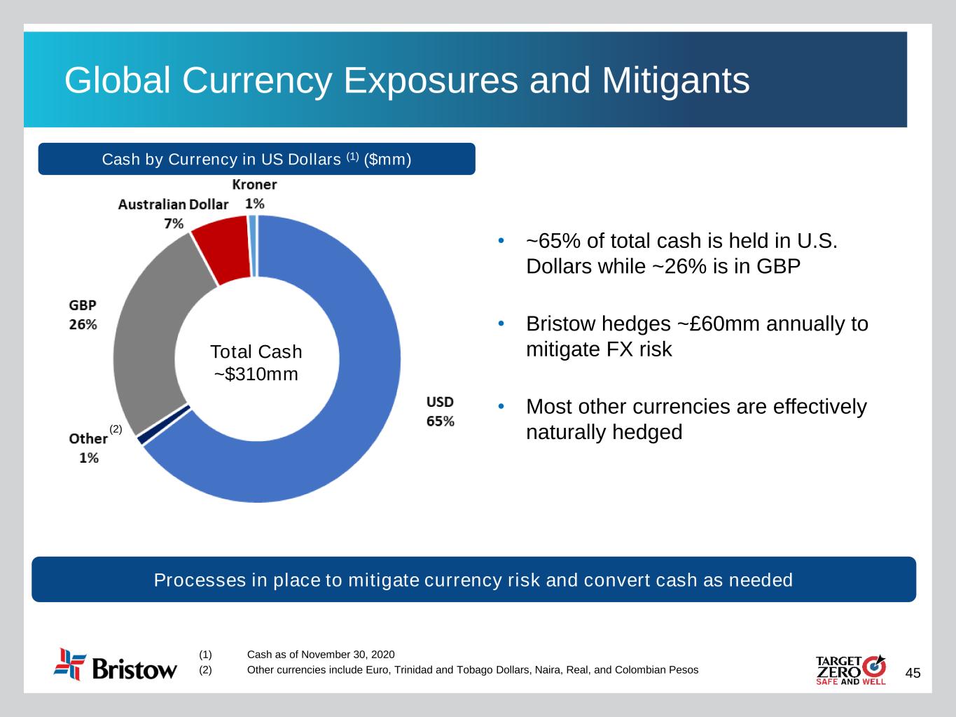 45 Global Currency Exposures and Mitigants Cash by Currency in US Dollars (1) ($mm) Total Cash ~$310mm • ~65% of total cash is held in U.S. Dollars while ~26% is in GBP • Bristow hedges ~£60mm annually to mitigate FX risk • Most other currencies are effectively naturally hedged(2) (1) Cash as of November 30, 2020 (2) Other currencies include Euro, Trinidad and Tobago Dollars, Naira, Real, and Colombian Pesos Processes in place to mitigate currency risk and convert cash as needed