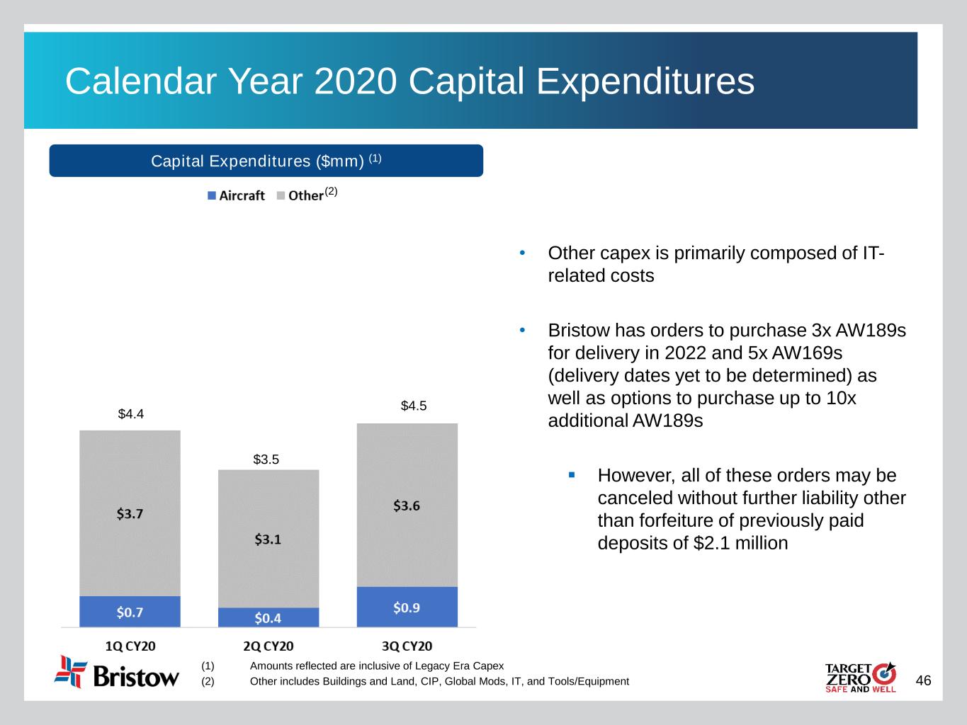 46 Calendar Year 2020 Capital Expenditures (1) Amounts reflected are inclusive of Legacy Era Capex (2) Other includes Buildings and Land, CIP, Global Mods, IT, and Tools/Equipment (2) Capital Expenditures ($mm) (1) • Other capex is primarily composed of IT- related costs • Bristow has orders to purchase 3x AW189s for delivery in 2022 and 5x AW169s (delivery dates yet to be determined) as well as options to purchase up to 10x additional AW189s ▪ However, all of these orders may be canceled without further liability other than forfeiture of previously paid deposits of $2.1 million $4.4 $3.5 $4.5