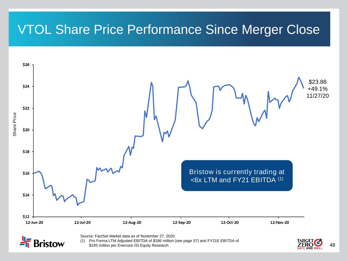 48 VTOL Share Price Performance Since Merger Close $23.88 +49.1% 11/27/20 S h a re P ri c e Source: FactSet Market data as of November 27, 2020 (1) Pro Forma LTM Adjusted EBITDA of $186 million (see page 57) and FY21E EBITDA of $193 million per Evercore ISI Equity Research Bristow is currently trading at <6x LTM and FY21 EBITDA (1)