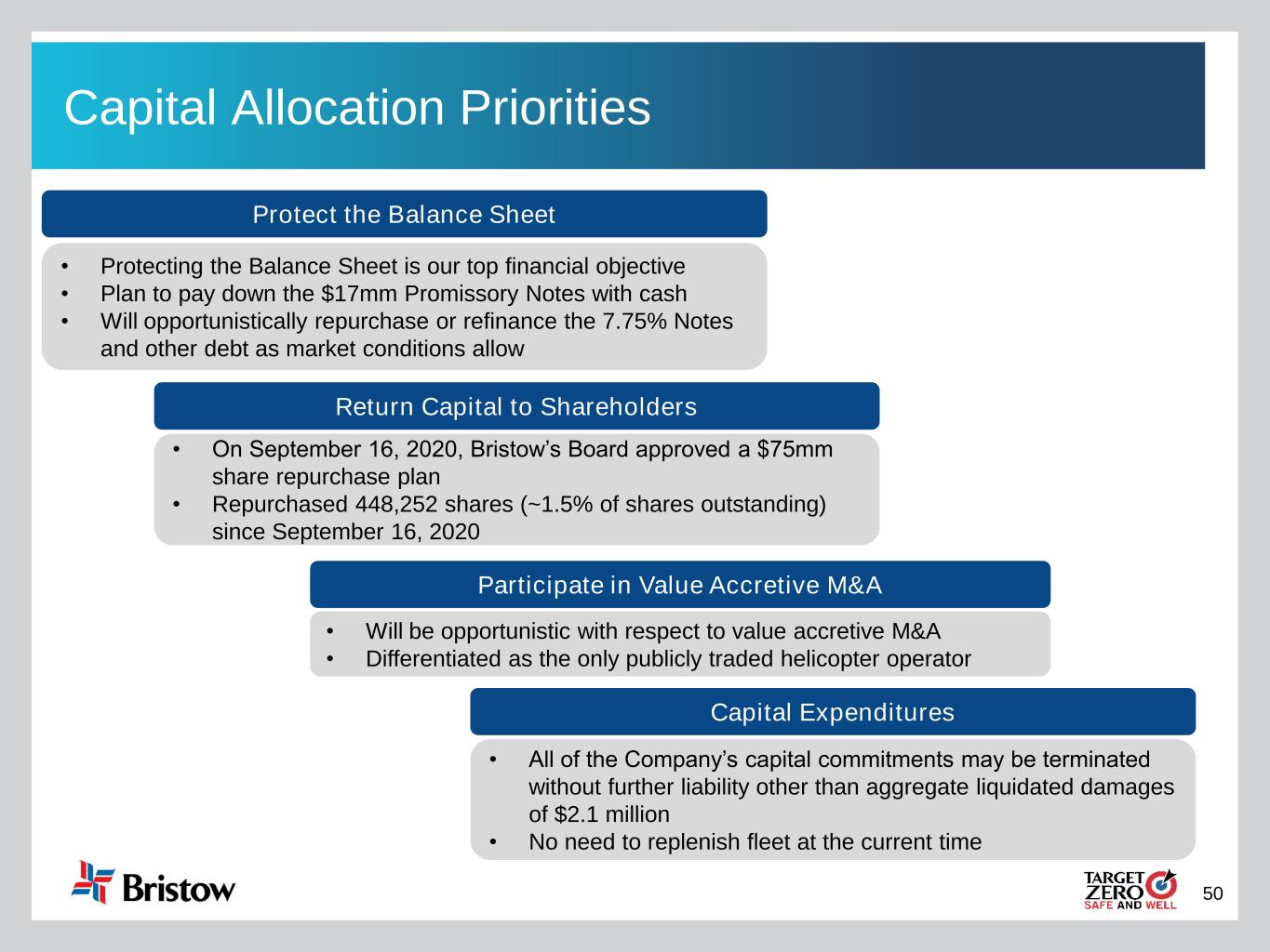 50 Capital Allocation Priorities Protect the Balance Sheet Participate in Value Accretive M&A Return Capital to Shareholders Capital Expenditures • Protecting the Balance Sheet is our top financial objective • Plan to pay down the $17mm Promissory Notes with cash • Will opportunistically repurchase or refinance the 7.75% Notes and other debt as market conditions allow • On September 16, 2020, Bristow’s Board approved a $75mm share repurchase plan • Repurchased 448,252 shares (~1.5% of shares outstanding) since September 16, 2020 • Will be opportunistic with respect to value accretive M&A • Differentiated as the only publicly traded helicopter operator • All of the Company’s capital commitments may be terminated without further liability other than aggregate liquidated damages of $2.1 million • No need to replenish fleet at the current time