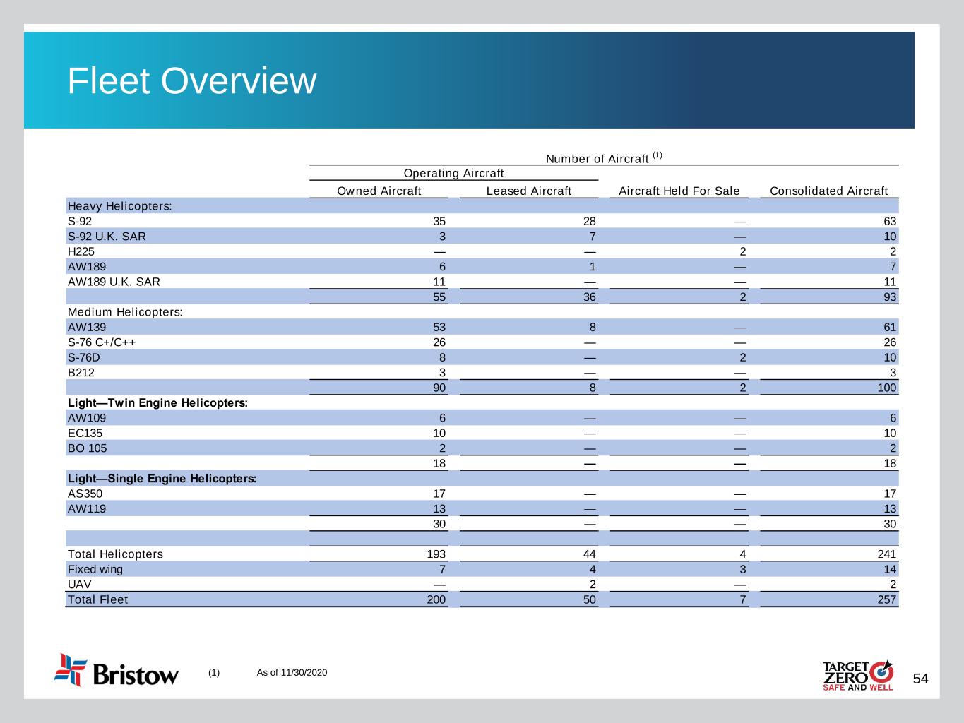 54 Fleet Overview (1) As of 11/30/2020 Owned Aircraft Leased Aircraft Aircraft Held For Sale Consolidated Aircraft Heavy Helicopters: S-92 35 28 — 63 S-92 U.K. SAR 3 7 — 10 H225 — — 2 2 AW189 6 1 — 7 AW189 U.K. SAR 11 — — 11 55 36 2 93 Medium Helicopters: AW139 53 8 — 61 S-76 C+/C++ 26 — — 26 S-76D 8 — 2 10 B212 3 — — 3 90 8 2 100 Light—Twin Engine Helicopters: AW109 6 — — 6 EC135 10 — — 10 BO 105 2 — — 2 18 — — 18 Light—Single Engine Helicopters: AS350 17 — — 17 AW119 13 — — 13 30 — — 30 Total Helicopters 193 44 4 241 Fixed wing 7 4 3 14 UAV — 2 — 2 Total Fleet 200 50 7 257 Number of Aircraft (1) Operating Aircraft