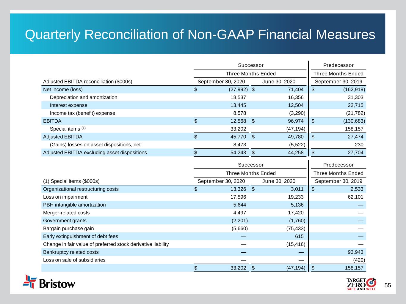 55 Quarterly Reconciliation of Non-GAAP Financial Measures Successor Predecessor Three Months Ended Three Months Ended Adjusted EBITDA reconciliation ($000s) September 30, 2020 June 30, 2020 September 30, 2019 Net income (loss) $ (27,992) $ 71,404 $ (162,919) Depreciation and amortization 18,537 16,356 31,303 Interest expense 13,445 12,504 22,715 Income tax (benefit) expense 8,578 (3,290) (21,782) EBITDA $ 12,568 $ 96,974 $ (130,683) Special items (1) 33,202 (47,194) 158,157 Adjusted EBITDA $ 45,770 $ 49,780 $ 27,474 (Gains) losses on asset dispositions, net 8,473 (5,522) 230 Adjusted EBITDA excluding asset dispositions $ 54,243 $ 44,258 $ 27,704 Successor Predecessor Three Months Ended Three Months Ended (1) Special items ($000s) September 30, 2020 June 30, 2020 September 30, 2019 Organizational restructuring costs $ 13,326 $ 3,011 $ 2,533 Loss on impairment 17,596 19,233 62,101 PBH intangible amortization 5,644 5,136 — Merger-related costs 4,497 17,420 — Government grants (2,201) (1,760) — Bargain purchase gain (5,660) (75,433) — Early extinguishment of debt fees — 615 — Change in fair value of preferred stock derivative liability — (15,416) — Bankruptcy related costs — — 93,943 Loss on sale of subsidiaries — — (420) $ 33,202 $ (47,194) $ 158,157