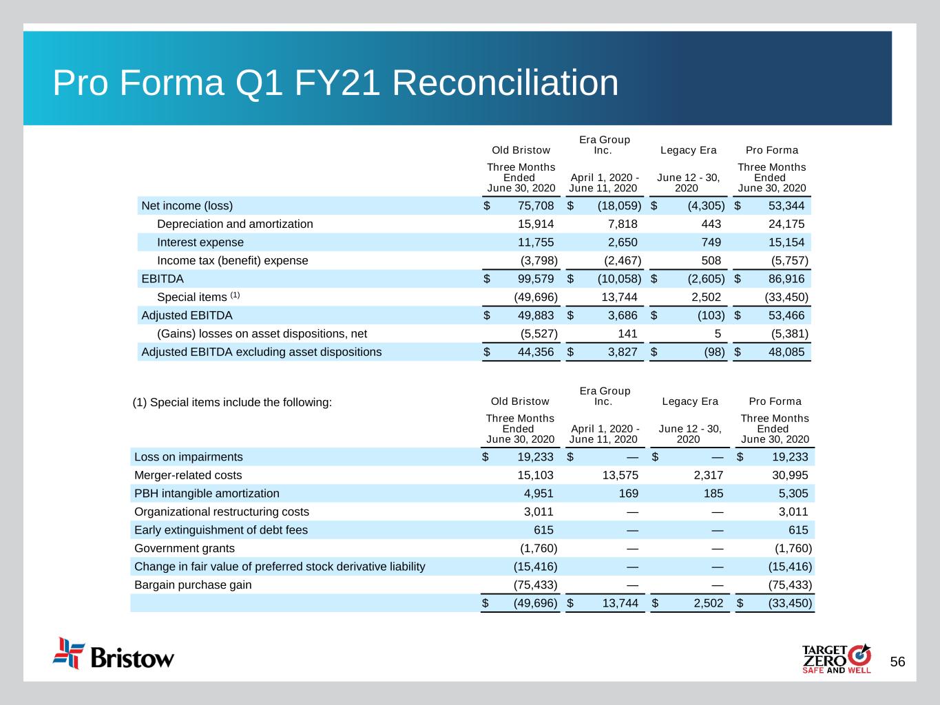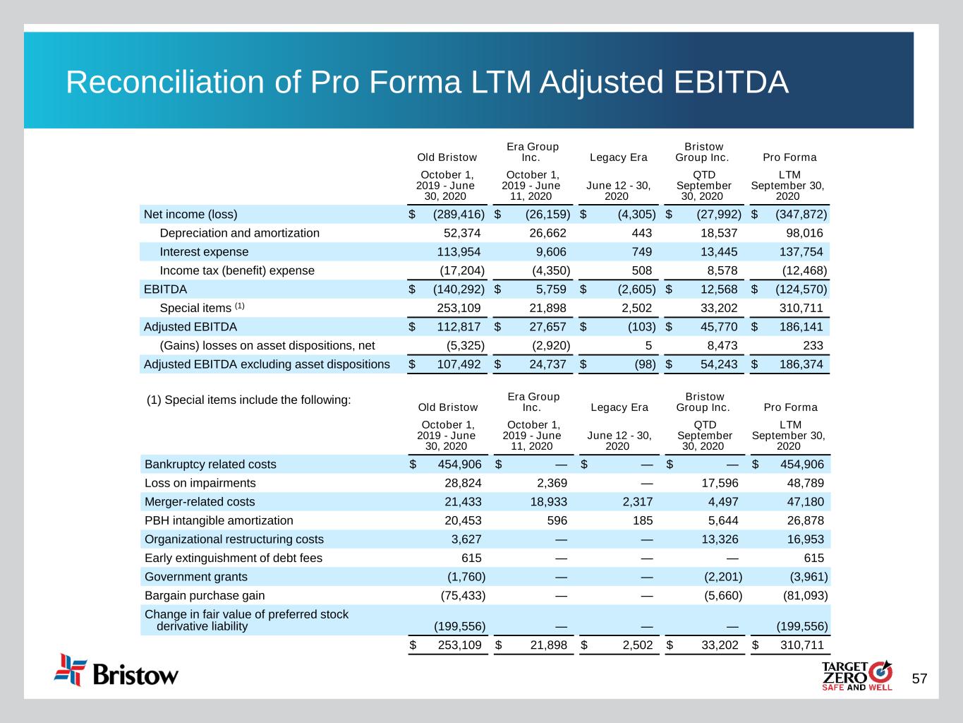 56 Pro Forma Q1 FY21 Reconciliation Old Bristow Era Group Inc. Legacy Era Pro Forma Three Months Ended June 30, 2020 April 1, 2020 - June 11, 2020 June 12 - 30, 2020 Three Months Ended June 30, 2020 Net income (loss) $ 75,708 $ (18,059) $ (4,305) $ 53,344 Depreciation and amortization 15,914 7,818 443 24,175 Interest expense 11,755 2,650 749 15,154 Income tax (benefit) expense (3,798) (2,467) 508 (5,757) EBITDA $ 99,579 $ (10,058) $ (2,605) $ 86,916 Special items (1) (49,696) 13,744 2,502 (33,450) Adjusted EBITDA $ 49,883 $ 3,686 $ (103) $ 53,466 (Gains) losses on asset dispositions, net (5,527) 141 5 (5,381) Adjusted EBITDA excluding asset dispositions $ 44,356 $ 3,827 $ (98) $ 48,085 Old Bristow Era Group Inc. Legacy Era Pro Forma Three Months Ended June 30, 2020 April 1, 2020 - June 11, 2020 June 12 - 30, 2020 Three Months Ended June 30, 2020 Loss on impairments $ 19,233 $ — $ — $ 19,233 Merger-related costs 15,103 13,575 2,317 30,995 PBH intangible amortization 4,951 169 185 5,305 Organizational restructuring costs 3,011 — — 3,011 Early extinguishment of debt fees 615 — — 615 Government grants (1,760) — — (1,760) Change in fair value of preferred stock derivative liability (15,416) — — (15,416) Bargain purchase gain (75,433) — — (75,433) $ (49,696) $ 13,744 $ 2,502 $ (33,450) (1) Special items include the following: