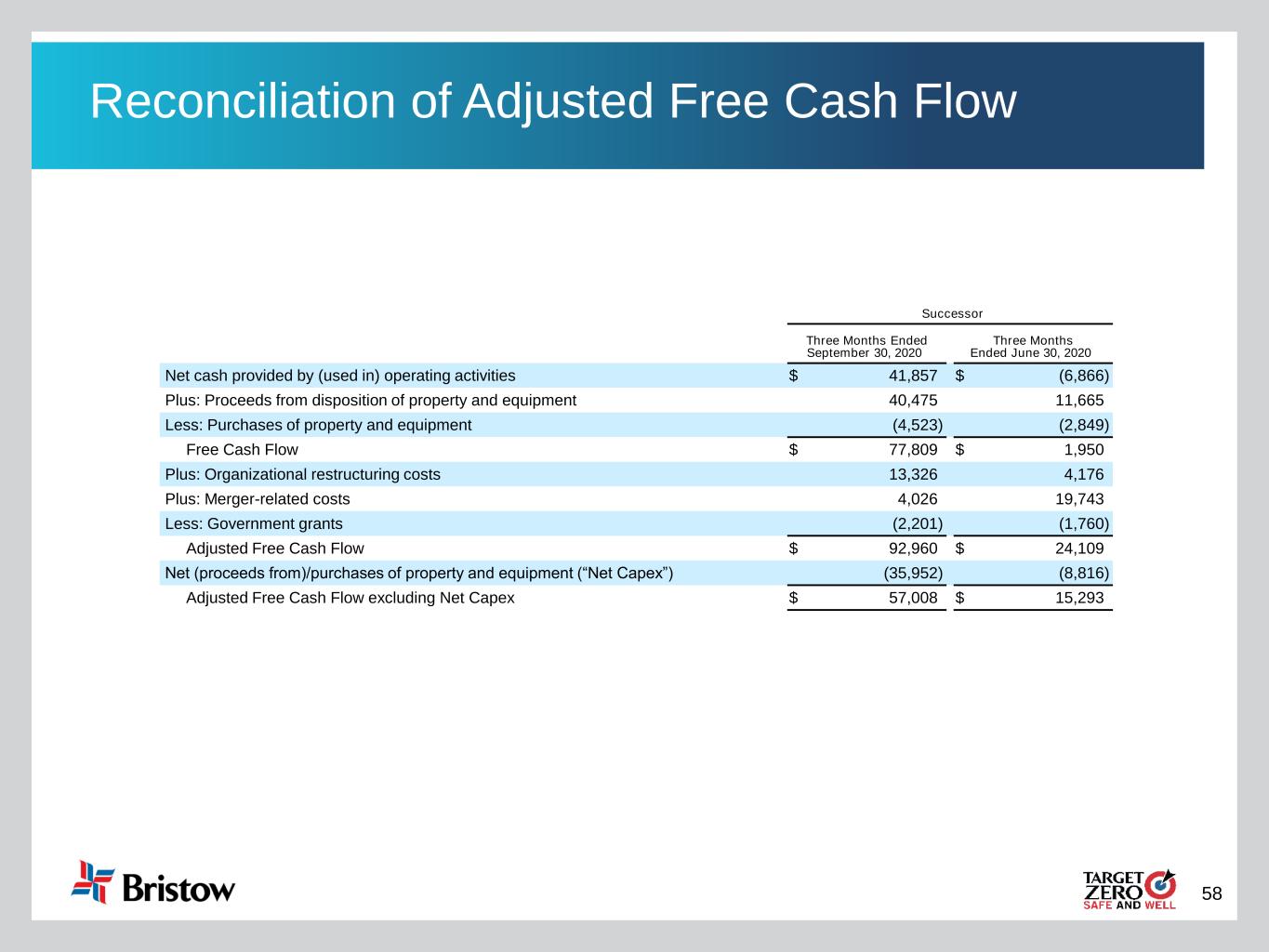 58 Reconciliation of Adjusted Free Cash Flow Successor Three Months Ended September 30, 2020 Three Months Ended June 30, 2020 Net cash provided by (used in) operating activities $ 41,857 $ (6,866) Plus: Proceeds from disposition of property and equipment 40,475 11,665 Less: Purchases of property and equipment (4,523) (2,849) Free Cash Flow $ 77,809 $ 1,950 Plus: Organizational restructuring costs 13,326 4,176 Plus: Merger-related costs 4,026 19,743 Less: Government grants (2,201) (1,760) Adjusted Free Cash Flow $ 92,960 $ 24,109 Net (proceeds from)/purchases of property and equipment (“Net Capex”) (35,952) (8,816) Adjusted Free Cash Flow excluding Net Capex $ 57,008 $ 15,293