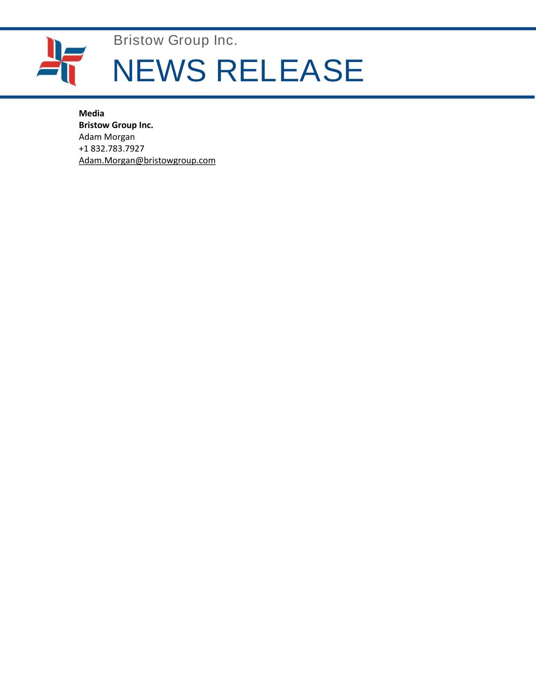 Bristow Group Inc. NEWS RELEASE Standards. In this role, he will be responsible for globally standardized maintenance programs and maintenance execution standards, operational standards, MRO and operational software standards, aircraft specifications and lease agreements, as well as all original equipment manufacturer relationships, global supply chain operations and aircraft acquisitions and sales. • Senior Vice President, Chief Financial Officer Jennifer Whalen will receive the added responsibility of overseeing our Information Technology department. She will also remain responsible for accounting, decision support, financial reporting, internal audit, investor relations, strategy and M&A, tax, and other financial functions of the Company. • There are no changes to the roles performed by Crystal Gordon, Senior Vice President, General Counsel; Mary Wersebe, Senior Vice President, Chief Administrative Officer; and James Stottlemyer, Vice President, Health, Safety and Environment. • Reporting to Stepanek will be David Martin, who will become Vice President, Commercial and New Markets. In this new role, the Company’s regional business development and sales teams focused on existing Bristow markets will report into Martin, and he will also support Stepanek in the pursuit of strategic diversification into new markets. • Reporting to Whalen will be Joe Pitzinger as Vice President, Treasurer & Corporate Development. “As the global leader in vertical flight solutions, Bristow remains steadfast in our commitment to deliver safe, efficient, and reliable service to our valued customers, while also continuing our heritage of progress through continuous improvement and innovation,” added Bradshaw. “We believe these changes are aligned with the evolving global Energy Transition and the transformation initiatives that are being implemented by many of our existing customers.” About Bristow Group Bristow Group Inc. is the leading global provider of vertical flight solutions. Bristow primarily provides aviation services to a broad base of major integrated, national and independent offshore energy companies. Bristow provides commercial search and rescue (“SAR”) services in several countries and public sector SAR services in the United Kingdom (“U.K.”) on behalf of the Maritime & Coastguard Agency (“MCA”). Additionally, the Company also offers ad hoc helicopter and fixed wing transportation services. Bristow currently has customers in Australia, Brazil, Canada, Chile, Colombia, Guyana, India, Mexico, Nigeria, Norway, Spain, Suriname, Trinidad, the U.K. and the U.S. To learn more, visit our website at www.bristowgroup.com. Investors Bristow Group Inc. Jennifer Whalen +1 713.369.4636 InvestorRelations@bristowgroup.com