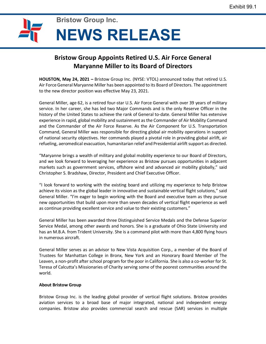 Bristow Group Inc. NEWS RELEASE Bristow Group Appoints Retired U.S. Air Force General Maryanne Miller to its Board of Directors HOUSTON, May 24, 2021 – Bristow Group Inc. (NYSE: VTOL) announced today that retired U.S. Air Force General Maryanne Miller has been appointed to its Board of Directors. The appointment to the new director position was effective May 23, 2021. General Miller, age 62, is a retired four-star U.S. Air Force General with over 39 years of military service. In her career, she has led two Major Commands and is the only Reserve Officer in the history of the United States to achieve the rank of General to-date. General Miller has extensive experience in rapid, global mobility and sustainment as the Commander of Air Mobility Command and the Commander of the Air Force Reserve. As the Air Component for U.S. Transportation Command, General Miller was responsible for directing global air mobility operations in support of national security objectives. Her commands played a pivotal role in providing global airlift, air refueling, aeromedical evacuation, humanitarian relief and Presidential airlift support as directed. “Maryanne brings a wealth of military and global mobility experience to our Board of Directors, and we look forward to leveraging her experience as Bristow pursues opportunities in adjacent markets such as government services, offshore wind and advanced air mobility globally,” said Christopher S. Bradshaw, Director, President and Chief Executive Officer. “I look forward to working with the existing board and utilizing my experience to help Bristow achieve its vision as the global leader in innovative and sustainable vertical flight solutions,” said General Miller. “I’m eager to begin working with the Board and executive team as they pursue new opportunities that build upon more than seven decades of vertical flight experience as well as continue providing excellent service and value to their existing customers.” General Miller has been awarded three Distinguished Service Medals and the Defense Superior Service Medal, among other awards and honors. She is a graduate of Ohio State University and has an M.B.A. from Trident University. She is a command pilot with more than 4,800 flying hours in numerous aircraft. General Miller serves as an advisor to New Vista Acquisition Corp., a member of the Board of Trustees for Manhattan College in Bronx, New York and an Honorary Board Member of The Leaven, a non-profit after school program for the poor in California. She is also a co-worker for St. Teresa of Calcutta’s Missionaries of Charity serving some of the poorest communities around the world. About Bristow Group Bristow Group Inc. is the leading global provider of vertical flight solutions. Bristow provides aviation services to a broad base of major integrated, national and independent energy companies. Bristow also provides commercial search and rescue (SAR) services in multiple Exhibit 99.1