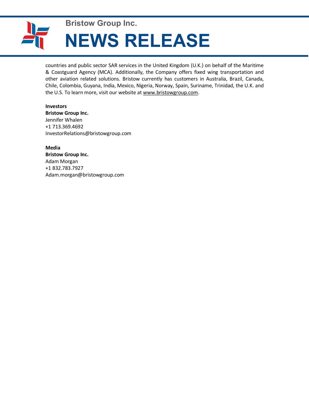 Bristow Group Inc. NEWS RELEASE countries and public sector SAR services in the United Kingdom (U.K.) on behalf of the Maritime & Coastguard Agency (MCA). Additionally, the Company offers fixed wing transportation and other aviation related solutions. Bristow currently has customers in Australia, Brazil, Canada, Chile, Colombia, Guyana, India, Mexico, Nigeria, Norway, Spain, Suriname, Trinidad, the U.K. and the U.S. To learn more, visit our website at www.bristowgroup.com. Investors Bristow Group Inc. Jennifer Whalen +1 713.369.4692 InvestorRelations@bristowgroup.com Media Bristow Group Inc. Adam Morgan +1 832.783.7927 Adam.morgan@bristowgroup.com