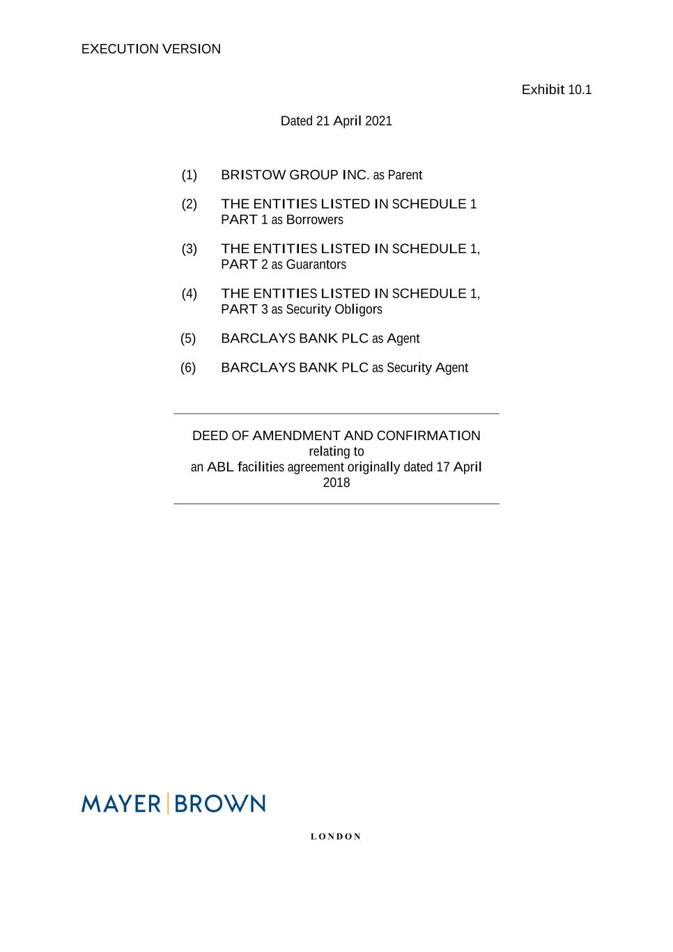EXECUTION VERSION L O N D O N Exhibit 10.1 Dated 21 April 2021 (1) BRISTOW GROUP INC. as Parent (2) THE ENTITIES LISTED IN SCHEDULE 1 PART 1 as Borrowers (3) THE ENTITIES LISTED IN SCHEDULE 1, PART 2 as Guarantors (4) THE ENTITIES LISTED IN SCHEDULE 1, PART 3 as Security Obligors (5) BARCLAYS BANK PLC as Agent (6) BARCLAYS BANK PLC as Security Agent DEED OF AMENDMENT AND CONFIRMATION relating to an ABL facilities agreement originally dated 17 April 2018
