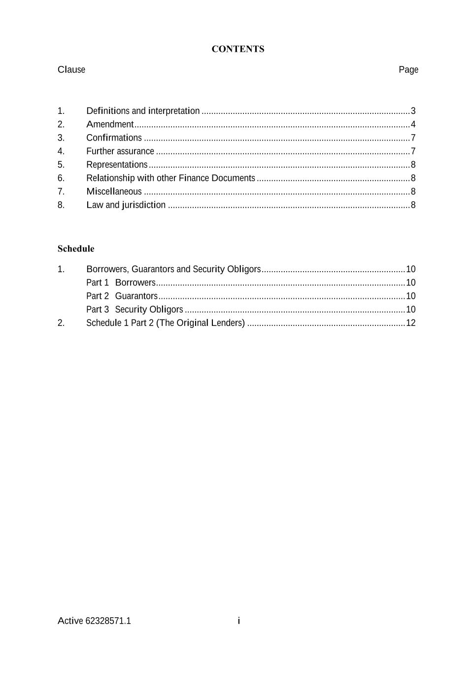 CONTENTS Clause Page Active 62328571.1 i 1. Definitions and interpretation ....................................................................................... 3 2. Amendment ................................................................................................................... 4 3. Confirmations ............................................................................................................... 7 4. Further assurance .......................................................................................................... 7 5. Representations ............................................................................................................. 8 6. Relationship with other Finance Documents ................................................................ 8 7. Miscellaneous ............................................................................................................... 8 8. Law and jurisdiction ..................................................................................................... 8 Schedule 1. Borrowers, Guarantors and Security Obligors ............................................................ 10 Part 1 Borrowers ........................................................................................................ 10 Part 2 Guarantors ....................................................................................................... 10 Part 3 Security Obligors ............................................................................................ 10 2. Schedule 1 Part 2 (The Original Lenders) .................................................................. 12