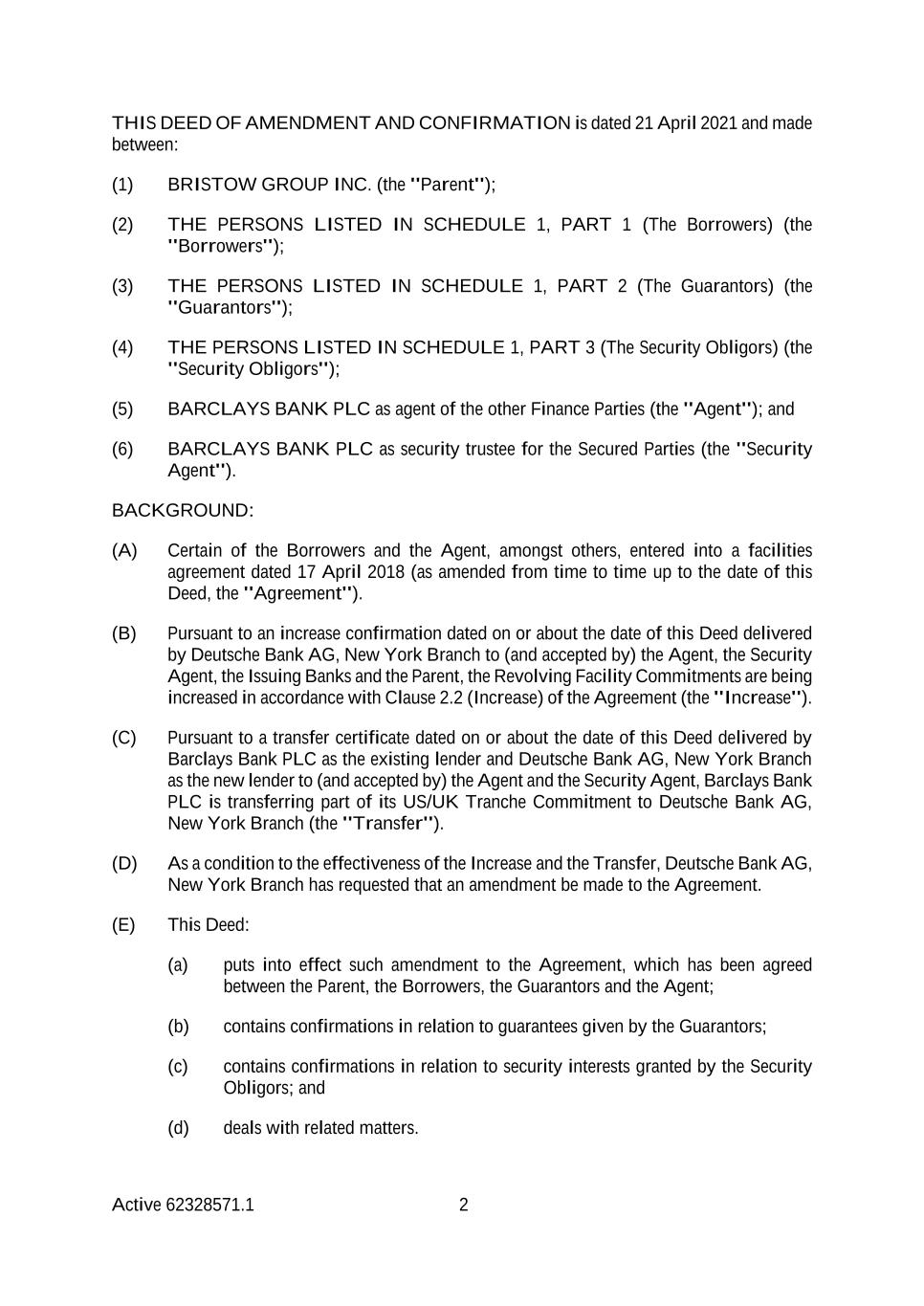 Active 62328571.1 2 THIS DEED OF AMENDMENT AND CONFIRMATION is dated 21 April 2021 and made between: (1) BRISTOW GROUP INC. (the "Parent"); (2) THE PERSONS LISTED IN SCHEDULE 1, PART 1 (The Borrowers) (the "Borrowers"); (3) THE PERSONS LISTED IN SCHEDULE 1, PART 2 (The Guarantors) (the "Guarantors"); (4) THE PERSONS LISTED IN SCHEDULE 1, PART 3 (The Security Obligors) (the "Security Obligors"); (5) BARCLAYS BANK PLC as agent of the other Finance Parties (the "Agent"); and (6) BARCLAYS BANK PLC as security trustee for the Secured Parties (the "Security Agent"). BACKGROUND: (A) Certain of the Borrowers and the Agent, amongst others, entered into a facilities agreement dated 17 April 2018 (as amended from time to time up to the date of this Deed, the "Agreement"). (B) Pursuant to an increase confirmation dated on or about the date of this Deed delivered by Deutsche Bank AG, New York Branch to (and accepted by) the Agent, the Security Agent, the Issuing Banks and the Parent, the Revolving Facility Commitments are being increased in accordance with Clause 2.2 (Increase) of the Agreement (the "Increase"). (C) Pursuant to a transfer certificate dated on or about the date of this Deed delivered by Barclays Bank PLC as the existing lender and Deutsche Bank AG, New York Branch as the new lender to (and accepted by) the Agent and the Security Agent, Barclays Bank PLC is transferring part of its US/UK Tranche Commitment to Deutsche Bank AG, New York Branch (the "Transfer"). (D) As a condition to the effectiveness of the Increase and the Transfer, Deutsche Bank AG, New York Branch has requested that an amendment be made to the Agreement. (E) This Deed: (a) puts into effect such amendment to the Agreement, which has been agreed between the Parent, the Borrowers, the Guarantors and the Agent; (b) contains confirmations in relation to guarantees given by the Guarantors; (c) contains confirmations in relation to security interests granted by the Security Obligors; and (d) deals with related matters.