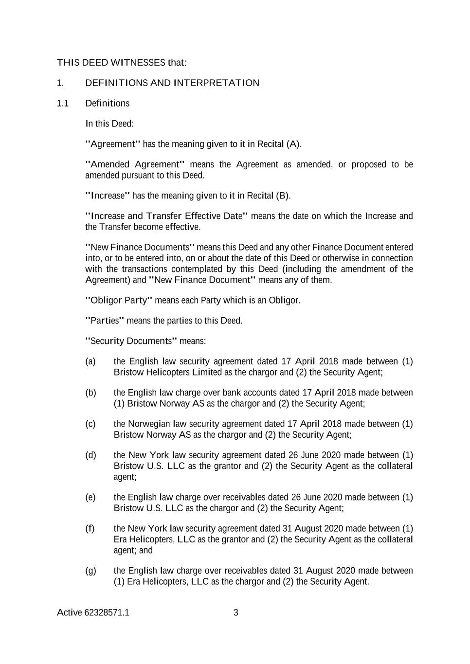 Active 62328571.1 3 THIS DEED WITNESSES that: 1. DEFINITIONS AND INTERPRETATION 1.1 Definitions In this Deed: "Agreement" has the meaning given to it in Recital (A). "Amended Agreement" means the Agreement as amended, or proposed to be amended pursuant to this Deed. "Increase" has the meaning given to it in Recital (B). "Increase and Transfer Effective Date" means the date on which the Increase and the Transfer become effective. "New Finance Documents" means this Deed and any other Finance Document entered into, or to be entered into, on or about the date of this Deed or otherwise in connection with the transactions contemplated by this Deed (including the amendment of the Agreement) and "New Finance Document" means any of them. "Obligor Party" means each Party which is an Obligor. "Parties" means the parties to this Deed. "Security Documents" means: (a) the English law security agreement dated 17 April 2018 made between (1) Bristow Helicopters Limited as the chargor and (2) the Security Agent; (b) the English law charge over bank accounts dated 17 April 2018 made between (1) Bristow Norway AS as the chargor and (2) the Security Agent; (c) the Norwegian law security agreement dated 17 April 2018 made between (1) Bristow Norway AS as the chargor and (2) the Security Agent; (d) the New York law security agreement dated 26 June 2020 made between (1) Bristow U.S. LLC as the grantor and (2) the Security Agent as the collateral agent; (e) the English law charge over receivables dated 26 June 2020 made between (1) Bristow U.S. LLC as the chargor and (2) the Security Agent; (f) the New York law security agreement dated 31 August 2020 made between (1) Era Helicopters, LLC as the grantor and (2) the Security Agent as the collateral agent; and (g) the English law charge over receivables dated 31 August 2020 made between (1) Era Helicopters, LLC as the chargor and (2) the Security Agent.