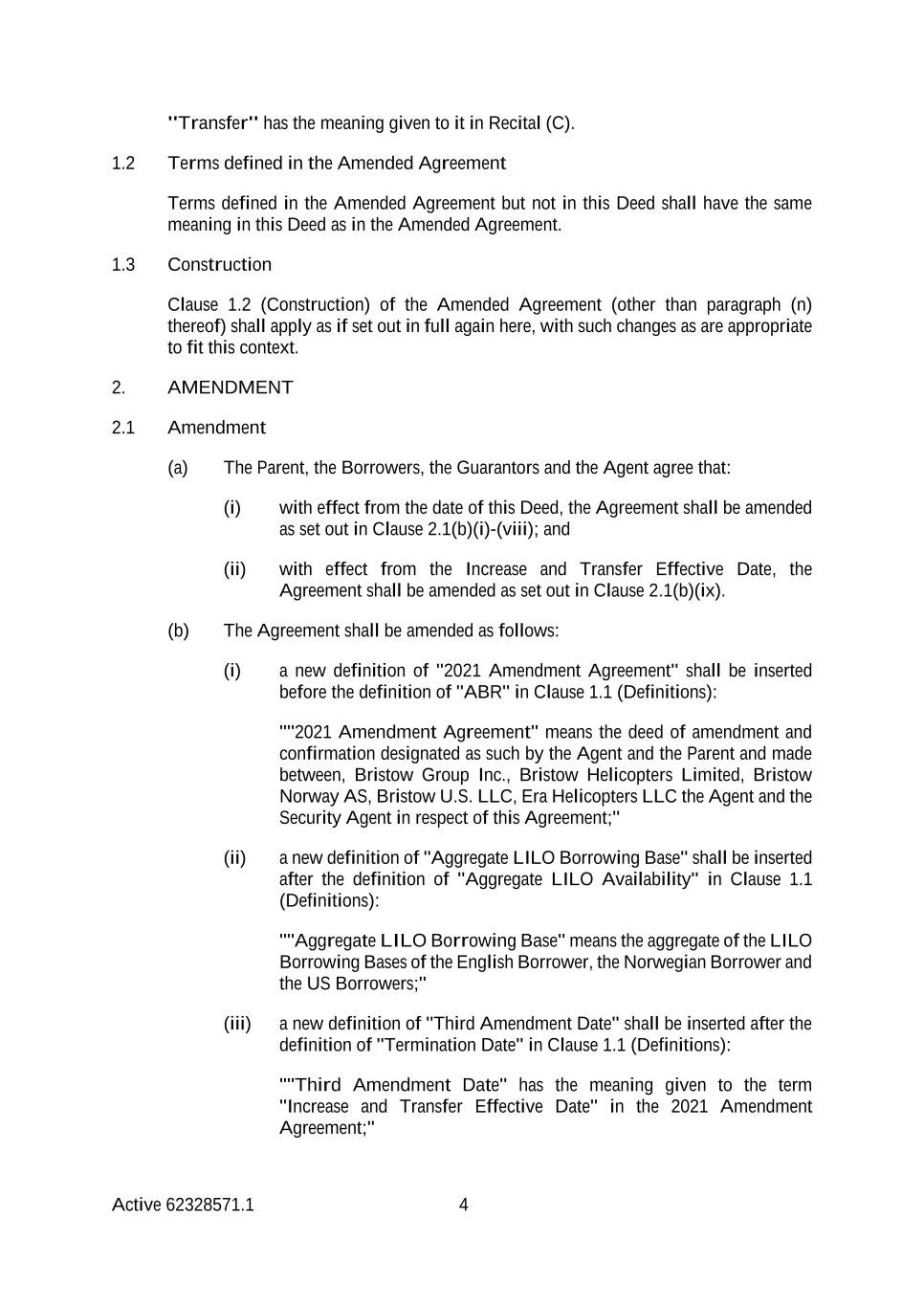 Active 62328571.1 4 "Transfer" has the meaning given to it in Recital (C). 1.2 Terms defined in the Amended Agreement Terms defined in the Amended Agreement but not in this Deed shall have the same meaning in this Deed as in the Amended Agreement. 1.3 Construction Clause 1.2 (Construction) of the Amended Agreement (other than paragraph (n) thereof) shall apply as if set out in full again here, with such changes as are appropriate to fit this context. 2. AMENDMENT 2.1 Amendment (a) The Parent, the Borrowers, the Guarantors and the Agent agree that: (i) with effect from the date of this Deed, the Agreement shall be amended as set out in Clause 2.1(b)(i)-(viii); and (ii) with effect from the Increase and Transfer Effective Date, the Agreement shall be amended as set out in Clause 2.1(b)(ix). (b) The Agreement shall be amended as follows: (i) a new definition of "2021 Amendment Agreement" shall be inserted before the definition of "ABR" in Clause 1.1 (Definitions): ""2021 Amendment Agreement" means the deed of amendment and confirmation designated as such by the Agent and the Parent and made between, Bristow Group Inc., Bristow Helicopters Limited, Bristow Norway AS, Bristow U.S. LLC, Era Helicopters LLC the Agent and the Security Agent in respect of this Agreement;" (ii) a new definition of "Aggregate LILO Borrowing Base" shall be inserted after the definition of "Aggregate LILO Availability" in Clause 1.1 (Definitions): ""Aggregate LILO Borrowing Base" means the aggregate of the LILO Borrowing Bases of the English Borrower, the Norwegian Borrower and the US Borrowers;" (iii) a new definition of "Third Amendment Date" shall be inserted after the definition of "Termination Date" in Clause 1.1 (Definitions): ""Third Amendment Date" has the meaning given to the term "Increase and Transfer Effective Date" in the 2021 Amendment Agreement;"