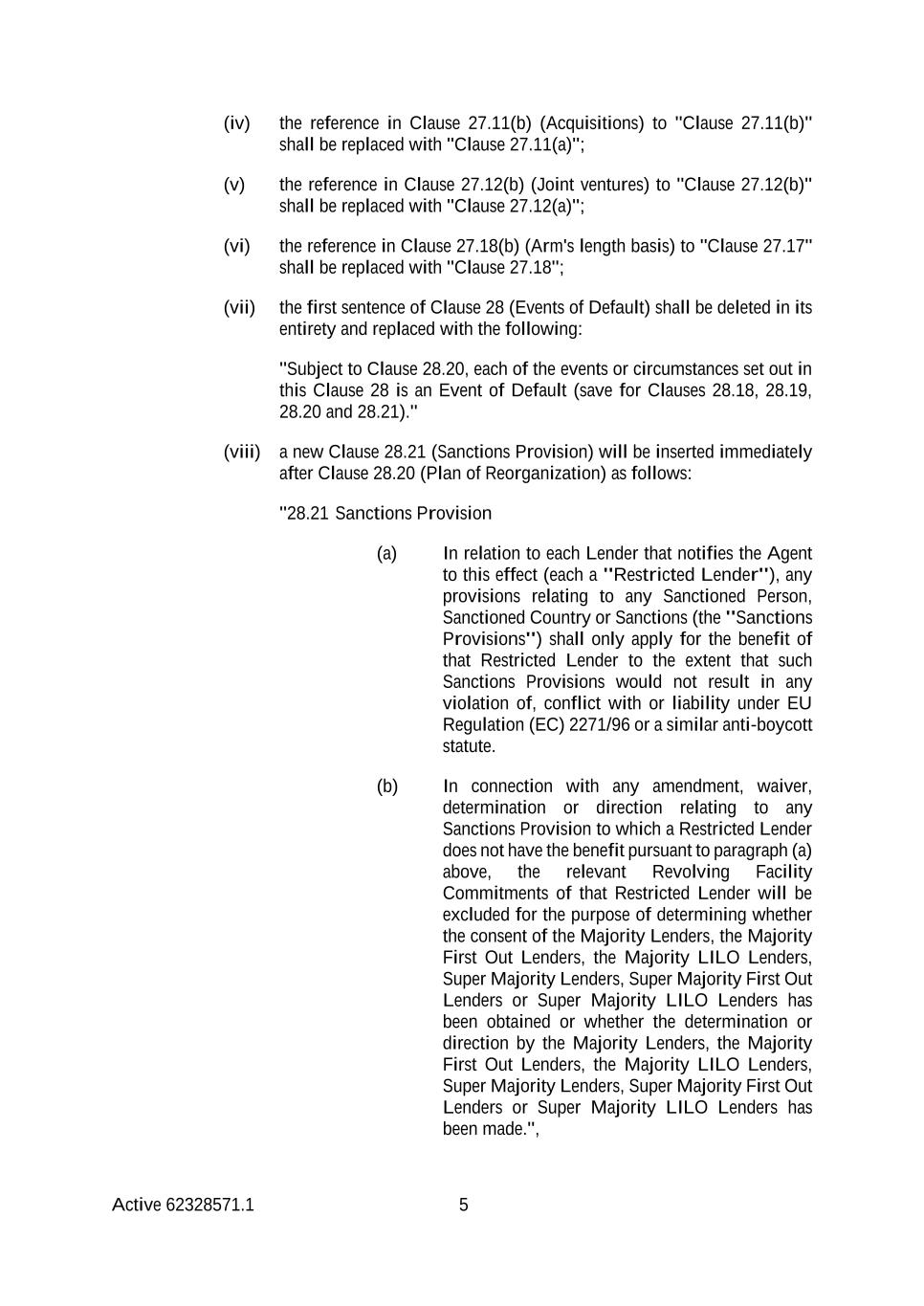 Active 62328571.1 5 (iv) the reference in Clause 27.11(b) (Acquisitions) to "Clause 27.11(b)" shall be replaced with "Clause 27.11(a)"; (v) the reference in Clause 27.12(b) (Joint ventures) to "Clause 27.12(b)" shall be replaced with "Clause 27.12(a)"; (vi) the reference in Clause 27.18(b) (Arm's length basis) to "Clause 27.17" shall be replaced with "Clause 27.18"; (vii) the first sentence of Clause 28 (Events of Default) shall be deleted in its entirety and replaced with the following: "Subject to Clause 28.20, each of the events or circumstances set out in this Clause 28 is an Event of Default (save for Clauses 28.18, 28.19, 28.20 and 28.21)." (viii) a new Clause 28.21 (Sanctions Provision) will be inserted immediately after Clause 28.20 (Plan of Reorganization) as follows: "28.21 Sanctions Provision (a) In relation to each Lender that notifies the Agent to this effect (each a "Restricted Lender"), any provisions relating to any Sanctioned Person, Sanctioned Country or Sanctions (the "Sanctions Provisions") shall only apply for the benefit of that Restricted Lender to the extent that such Sanctions Provisions would not result in any violation of, conflict with or liability under EU Regulation (EC) 2271/96 or a similar anti-boycott statute. (b) In connection with any amendment, waiver, determination or direction relating to any Sanctions Provision to which a Restricted Lender does not have the benefit pursuant to paragraph (a) above, the relevant Revolving Facility Commitments of that Restricted Lender will be excluded for the purpose of determining whether the consent of the Majority Lenders, the Majority First Out Lenders, the Majority LILO Lenders, Super Majority Lenders, Super Majority First Out Lenders or Super Majority LILO Lenders has been obtained or whether the determination or direction by the Majority Lenders, the Majority First Out Lenders, the Majority LILO Lenders, Super Majority Lenders, Super Majority First Out Lenders or Super Majority LILO Lenders has been made.",
