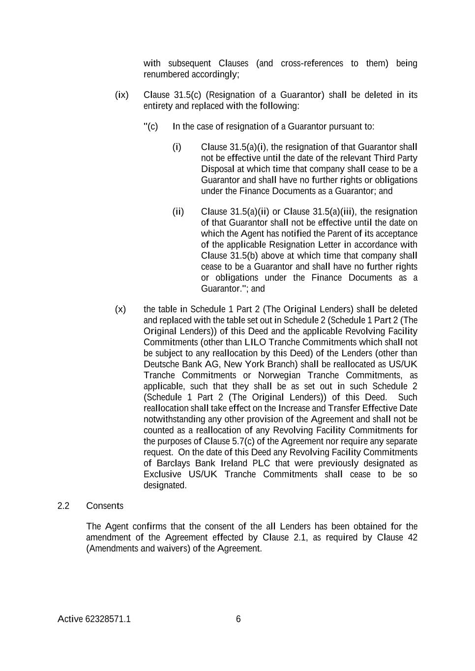 Active 62328571.1 6 with subsequent Clauses (and cross-references to them) being renumbered accordingly; (ix) Clause 31.5(c) (Resignation of a Guarantor) shall be deleted in its entirety and replaced with the following: "(c) In the case of resignation of a Guarantor pursuant to: (i) Clause 31.5(a)(i), the resignation of that Guarantor shall not be effective until the date of the relevant Third Party Disposal at which time that company shall cease to be a Guarantor and shall have no further rights or obligations under the Finance Documents as a Guarantor; and (ii) Clause 31.5(a)(ii) or Clause 31.5(a)(iii), the resignation of that Guarantor shall not be effective until the date on which the Agent has notified the Parent of its acceptance of the applicable Resignation Letter in accordance with Clause 31.5(b) above at which time that company shall cease to be a Guarantor and shall have no further rights or obligations under the Finance Documents as a Guarantor."; and (x) the table in Schedule 1 Part 2 (The Original Lenders) shall be deleted and replaced with the table set out in Schedule 2 (Schedule 1 Part 2 (The Original Lenders)) of this Deed and the applicable Revolving Facility Commitments (other than LILO Tranche Commitments which shall not be subject to any reallocation by this Deed) of the Lenders (other than Deutsche Bank AG, New York Branch) shall be reallocated as US/UK Tranche Commitments or Norwegian Tranche Commitments, as applicable, such that they shall be as set out in such Schedule 2 (Schedule 1 Part 2 (The Original Lenders)) of this Deed. Such reallocation shall take effect on the Increase and Transfer Effective Date notwithstanding any other provision of the Agreement and shall not be counted as a reallocation of any Revolving Facility Commitments for the purposes of Clause 5.7(c) of the Agreement nor require any separate request. On the date of this Deed any Revolving Facility Commitments of Barclays Bank Ireland PLC that were previously designated as Exclusive US/UK Tranche Commitments shall cease to be so designated. 2.2 Consents The Agent confirms that the consent of the all Lenders has been obtained for the amendment of the Agreement effected by Clause 2.1, as required by Clause 42 (Amendments and waivers) of the Agreement.