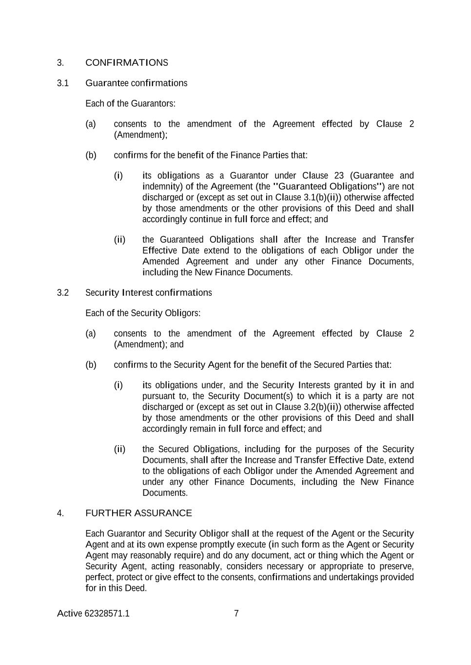 Active 62328571.1 7 3. CONFIRMATIONS 3.1 Guarantee confirmations Each of the Guarantors: (a) consents to the amendment of the Agreement effected by Clause 2 (Amendment); (b) confirms for the benefit of the Finance Parties that: (i) its obligations as a Guarantor under Clause 23 (Guarantee and indemnity) of the Agreement (the "Guaranteed Obligations") are not discharged or (except as set out in Clause 3.1(b)(ii)) otherwise affected by those amendments or the other provisions of this Deed and shall accordingly continue in full force and effect; and (ii) the Guaranteed Obligations shall after the Increase and Transfer Effective Date extend to the obligations of each Obligor under the Amended Agreement and under any other Finance Documents, including the New Finance Documents. 3.2 Security Interest confirmations Each of the Security Obligors: (a) consents to the amendment of the Agreement effected by Clause 2 (Amendment); and (b) confirms to the Security Agent for the benefit of the Secured Parties that: (i) its obligations under, and the Security Interests granted by it in and pursuant to, the Security Document(s) to which it is a party are not discharged or (except as set out in Clause 3.2(b)(ii)) otherwise affected by those amendments or the other provisions of this Deed and shall accordingly remain in full force and effect; and (ii) the Secured Obligations, including for the purposes of the Security Documents, shall after the Increase and Transfer Effective Date, extend to the obligations of each Obligor under the Amended Agreement and under any other Finance Documents, including the New Finance Documents. 4. FURTHER ASSURANCE Each Guarantor and Security Obligor shall at the request of the Agent or the Security Agent and at its own expense promptly execute (in such form as the Agent or Security Agent may reasonably require) and do any document, act or thing which the Agent or Security Agent, acting reasonably, considers necessary or appropriate to preserve, perfect, protect or give effect to the consents, confirmations and undertakings provided for in this Deed.