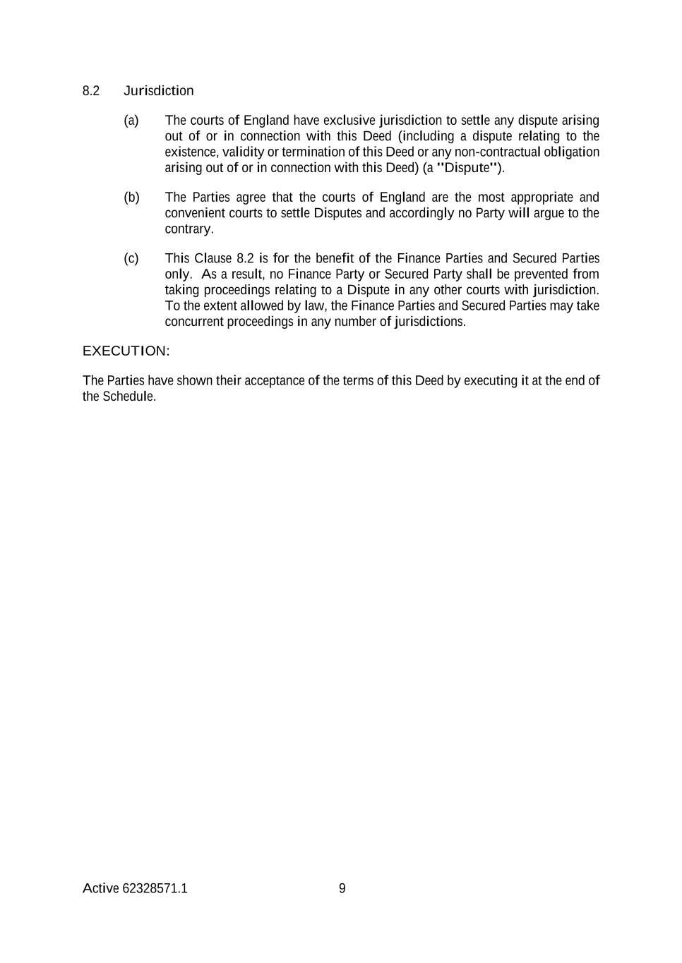 Active 62328571.1 9 8.2 Jurisdiction (a) The courts of England have exclusive jurisdiction to settle any dispute arising out of or in connection with this Deed (including a dispute relating to the existence, validity or termination of this Deed or any non-contractual obligation arising out of or in connection with this Deed) (a "Dispute"). (b) The Parties agree that the courts of England are the most appropriate and convenient courts to settle Disputes and accordingly no Party will argue to the contrary. (c) This Clause 8.2 is for the benefit of the Finance Parties and Secured Parties only. As a result, no Finance Party or Secured Party shall be prevented from taking proceedings relating to a Dispute in any other courts with jurisdiction. To the extent allowed by law, the Finance Parties and Secured Parties may take concurrent proceedings in any number of jurisdictions. EXECUTION: The Parties have shown their acceptance of the terms of this Deed by executing it at the end of the Schedule.