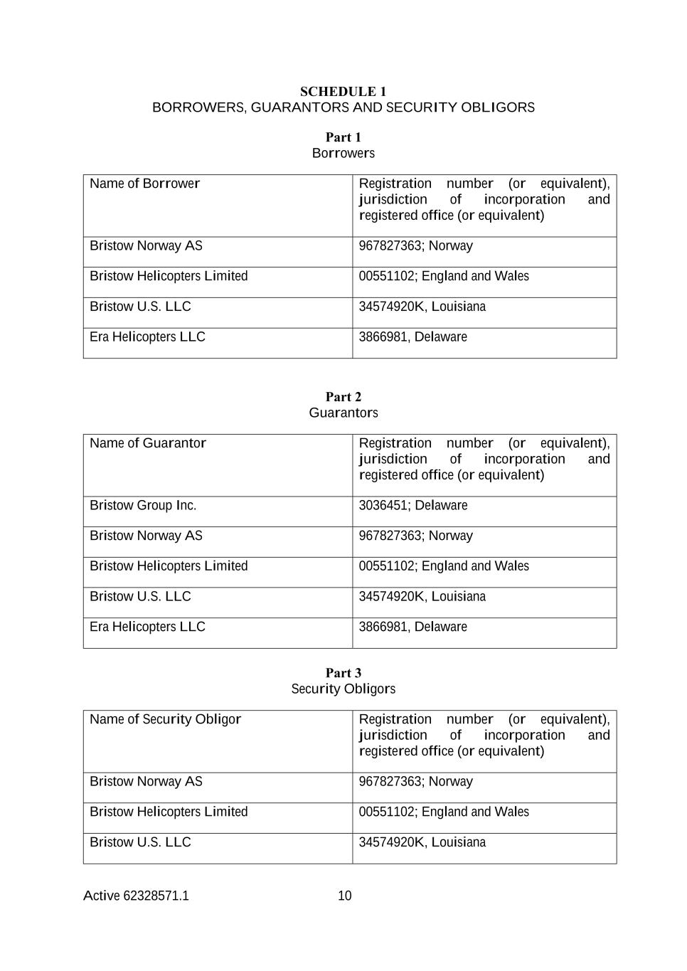Active 62328571.1 10 SCHEDULE 1 BORROWERS, GUARANTORS AND SECURITY OBLIGORS Part 1 Borrowers Name of Borrower Registration number (or equivalent), jurisdiction of incorporation and registered office (or equivalent) Bristow Norway AS 967827363; Norway Bristow Helicopters Limited 00551102; England and Wales Bristow U.S. LLC 34574920K, Louisiana Era Helicopters LLC 3866981, Delaware Part 2 Guarantors Name of Guarantor Registration number (or equivalent), jurisdiction of incorporation and registered office (or equivalent) Bristow Group Inc. 3036451; Delaware Bristow Norway AS 967827363; Norway Bristow Helicopters Limited 00551102; England and Wales Bristow U.S. LLC 34574920K, Louisiana Era Helicopters LLC 3866981, Delaware Part 3 Security Obligors Name of Security Obligor Registration number (or equivalent), jurisdiction of incorporation and registered office (or equivalent) Bristow Norway AS 967827363; Norway Bristow Helicopters Limited 00551102; England and Wales Bristow U.S. LLC 34574920K, Louisiana