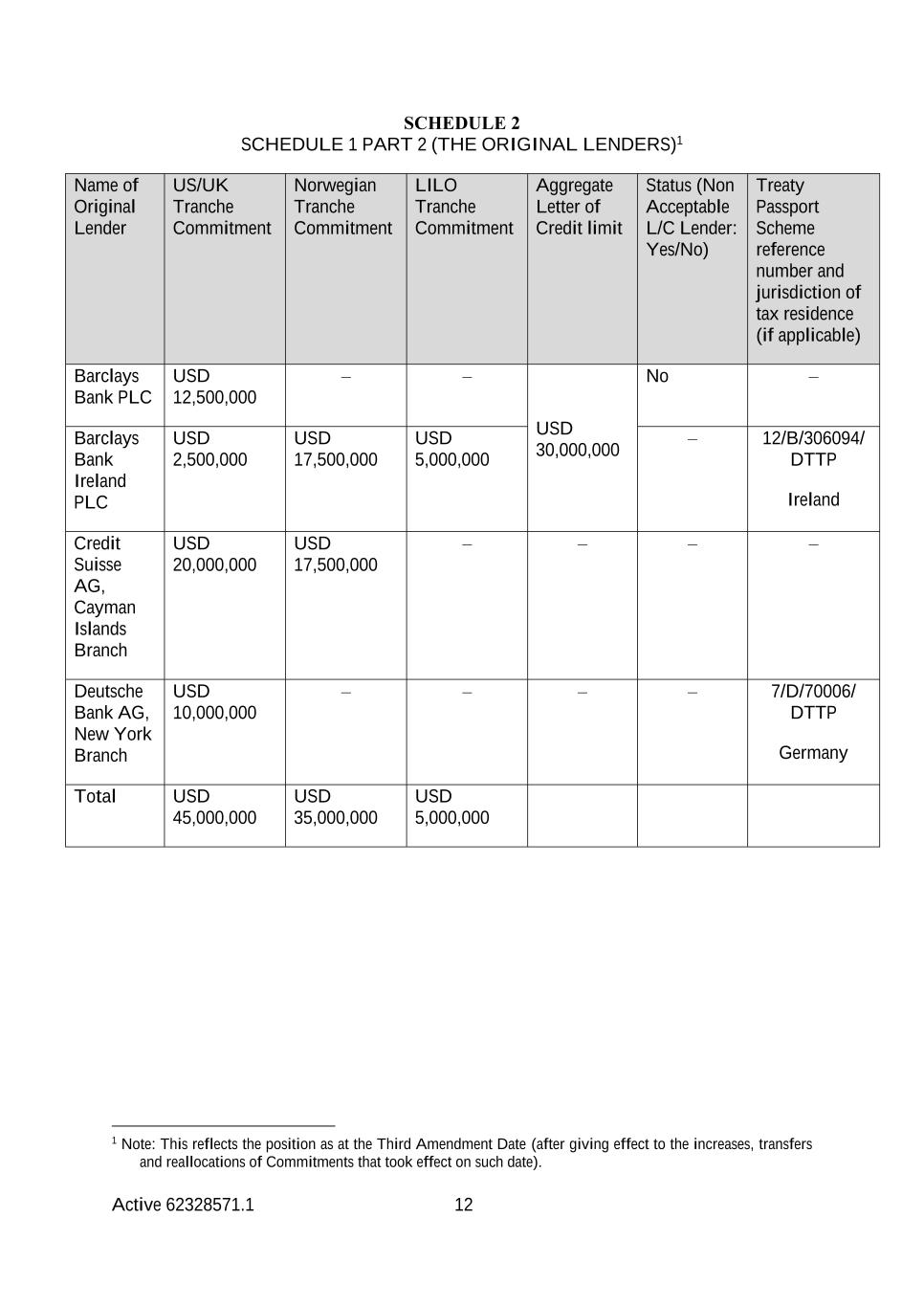 Active 62328571.1 12 SCHEDULE 2 SCHEDULE 1 PART 2 (THE ORIGINAL LENDERS)1 Name of Original Lender US/UK Tranche Commitment Norwegian Tranche Commitment LILO Tranche Commitment Aggregate Letter of Credit limit Status (Non Acceptable L/C Lender: Yes/No) Treaty Passport Scheme reference number and jurisdiction of tax residence (if applicable) Barclays Bank PLC USD 12,500,000 – – USD 30,000,000 No – Barclays Bank Ireland PLC USD 2,500,000 USD 17,500,000 USD 5,000,000 – 12/B/306094/ DTTP Ireland Credit Suisse AG, Cayman Islands Branch USD 20,000,000 USD 17,500,000 – – – – Deutsche Bank AG, New York Branch USD 10,000,000 – – – – 7/D/70006/ DTTP Germany Total USD 45,000,000 USD 35,000,000 USD 5,000,000 1 Note: This reflects the position as at the Third Amendment Date (after giving effect to the increases, transfers and reallocations of Commitments that took effect on such date).