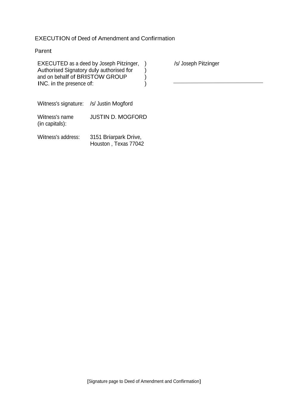 [Signature page to Deed of Amendment and Confirmation] EXECUTION of Deed of Amendment and Confirmation Parent /s/ Joseph Pitzinger Witness's signature: /s/ Justin Mogford Witness's name (in capitals): JUSTIN D. MOGFORD Witness's address: 3151 Briarpark Drive, Houston , Texas 77042 EXECUTED as a deed by Joseph Pitzinger, Authorised Signatory duly authorised for and on behalf of BRISTOW GROUP INC. in the presence of: ) ) ) )