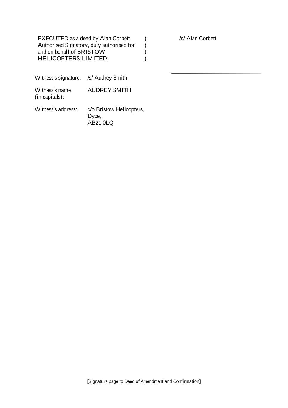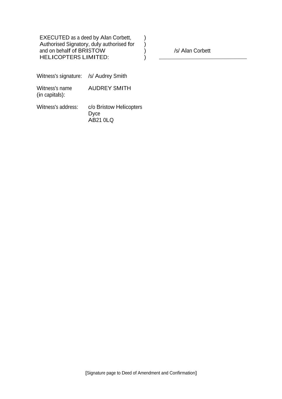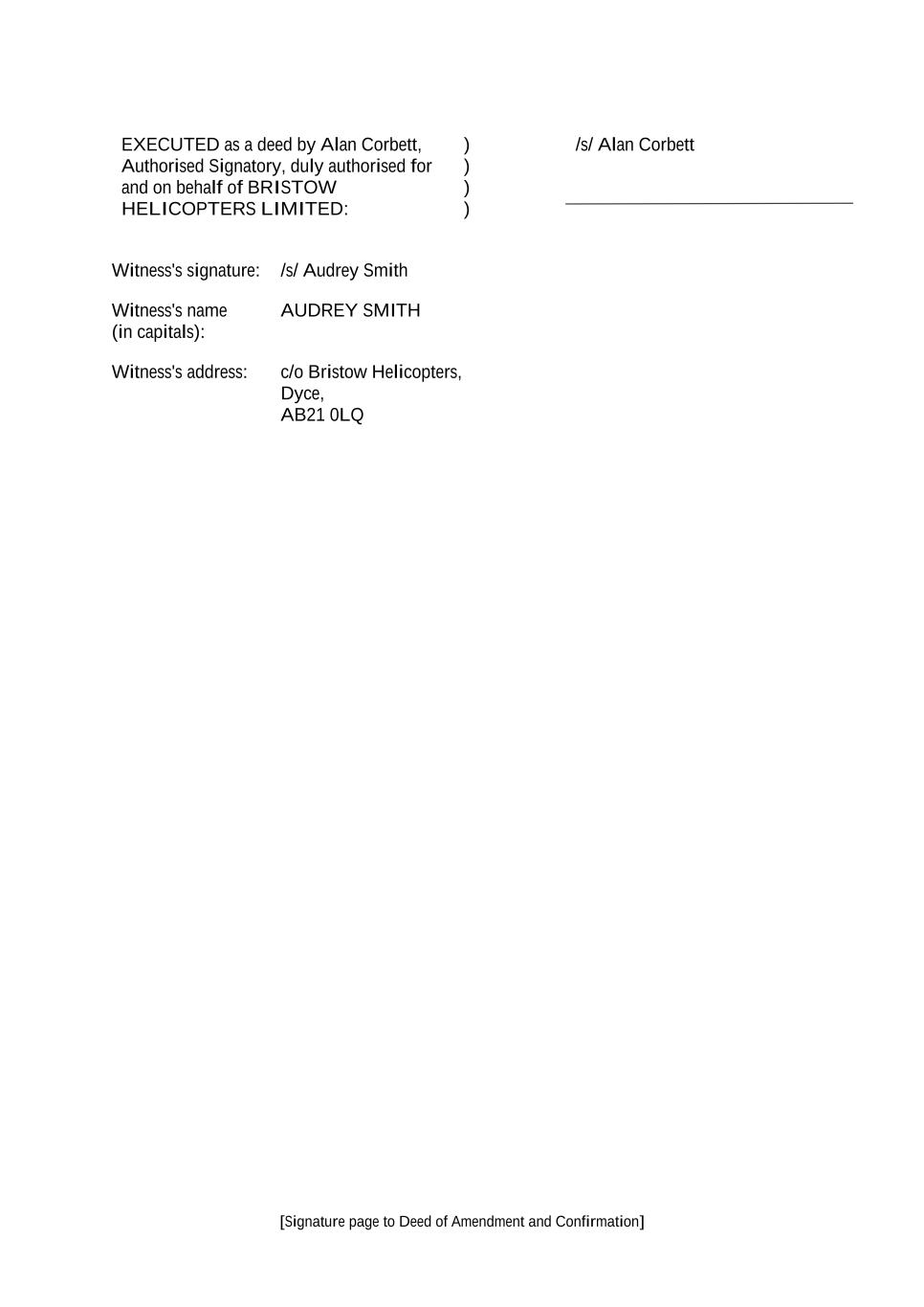[Signature page to Deed of Amendment and Confirmation] EXECUTED as a deed by Alan Corbett, Authorised Signatory, duly authorised for and on behalf of BRISTOW HELICOPTERS LIMITED: ) /s/ Alan Corbett ) ) ) Witness's signature: /s/ Audrey Smith Witness's name (in capitals): AUDREY SMITH Witness's address: c/o Bristow Helicopters, Dyce, AB21 0LQ