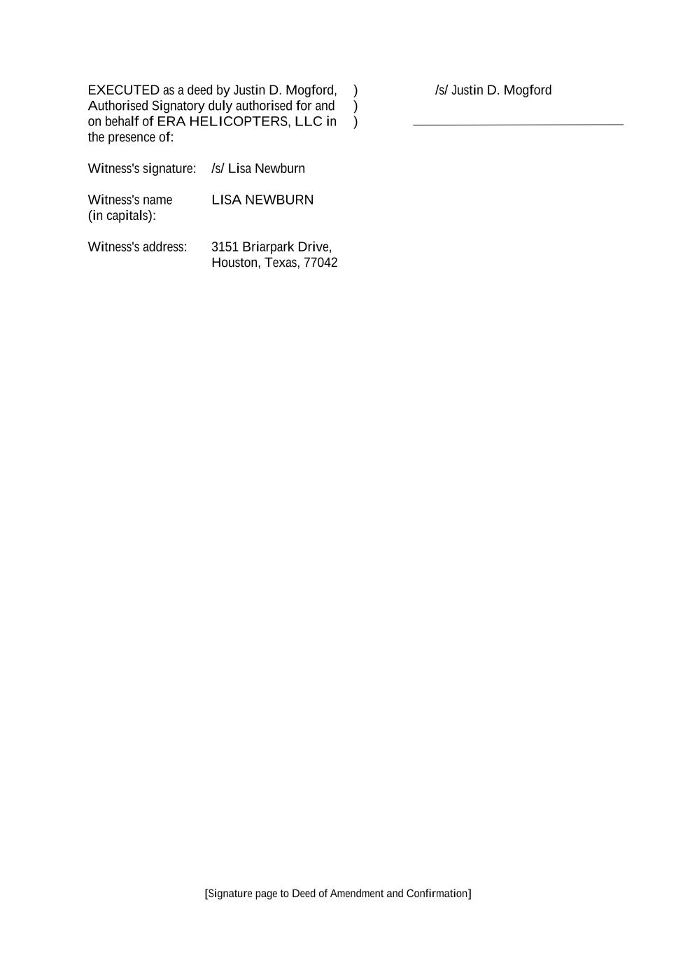 [Signature page to Deed of Amendment and Confirmation] EXECUTED as a deed by Justin D. Mogford, Authorised Signatory duly authorised for and on behalf of ERA HELICOPTERS, LLC in the presence of: ) /s/ Justin Mogford ) ) Witness's signature: /s/ Lisa Newburn Witness's name (in capitals): LISA NEWBURN Witness's address: 3151 Briarpark Drive, Houston, Texas 77042