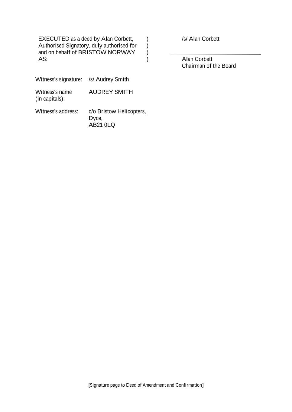 [Signature page to Deed of Amendment and Confirmation] EXECUTED as a deed by Alan Corbett, Authorised Signatory, duly authorised for and on behalf of BRISTOW NORWAY AS: ) /s/ Alan Corbett ) ) ) Alan Corbett Chairman of the Board Witness's signature: /s/ Audrey Smith Witness's name (in capitals): AUDREY SMITH Witness's address: c/o Bristow Helicopters, Dyce, AB21 0LQ