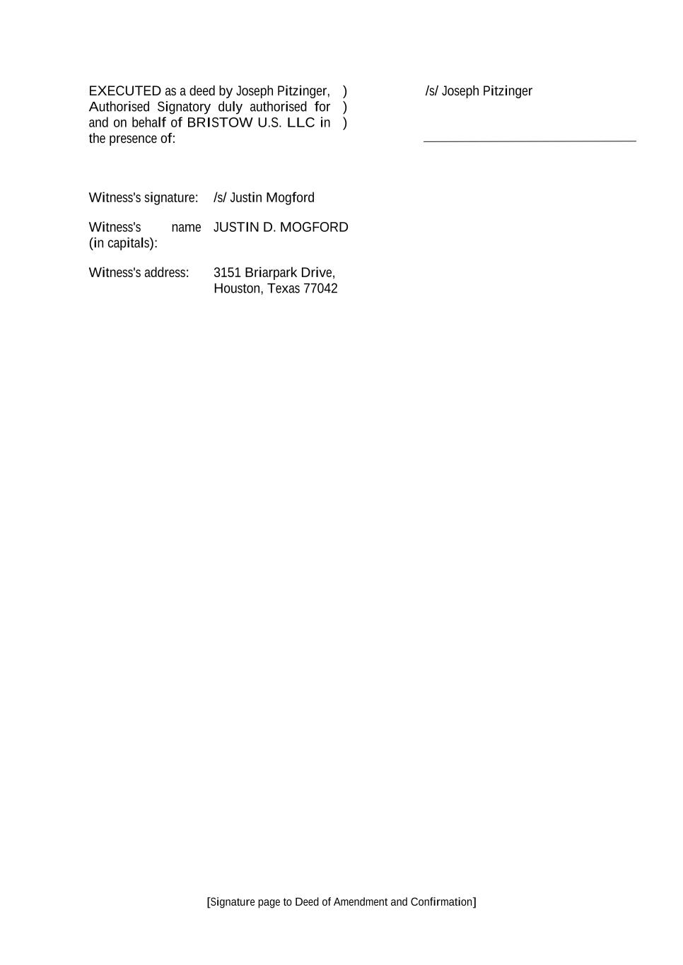 [Signature page to Deed of Amendment and Confirmation] EXECUTED as a deed by Joseph Pitzinger, Authorised Signatory duly authorised for and on behalf of BRISTOW U.S. LLC in the presence of: ) /s/ Joseph Pitzinger ) ) Witness's signature: /s/ Justin Mogford Witness's name (in capitals): JUSTIN D. MOGFORD Witness's address: 3151 Briarpark Drive, Houston, Texas 77042