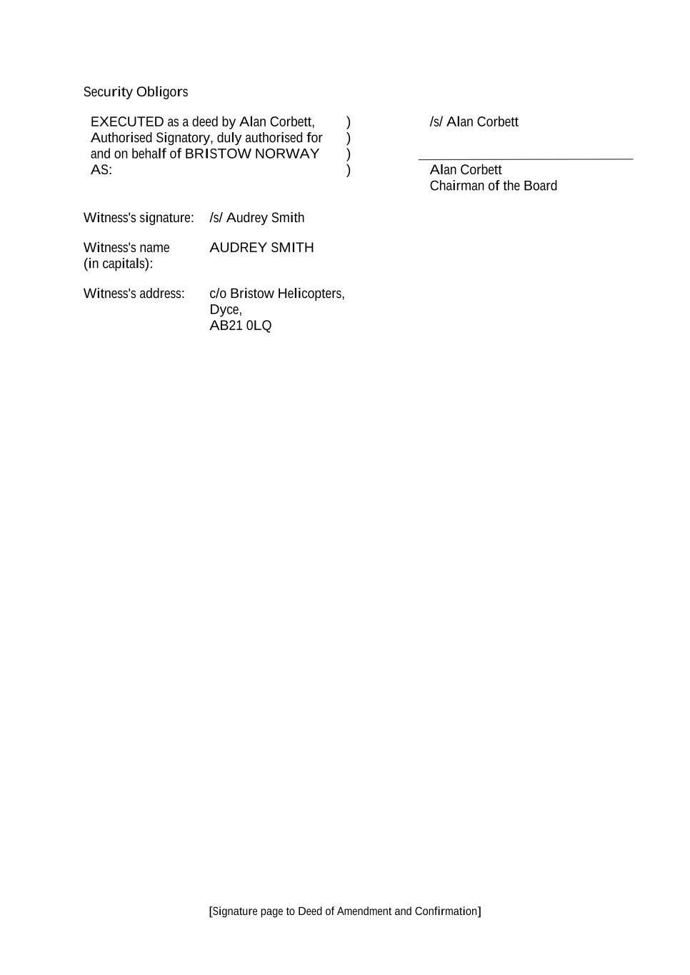 [Signature page to Deed of Amendment and Confirmation] Security Obligors EXECUTED as a deed by Alan Corbett, Authorised Signatory, duly authorised for and on behalf of BRISTOW NORWAY AS: ) /s/ Alan Corbett ) ) ) Alan Corbett Chairman of the Board Witness's signature: /s/ Audrey Smith Witness's name (in capitals): AUDREY SMITH Witness's address: c/o Bristow Helicopters, Dyce, AB21 0LQ