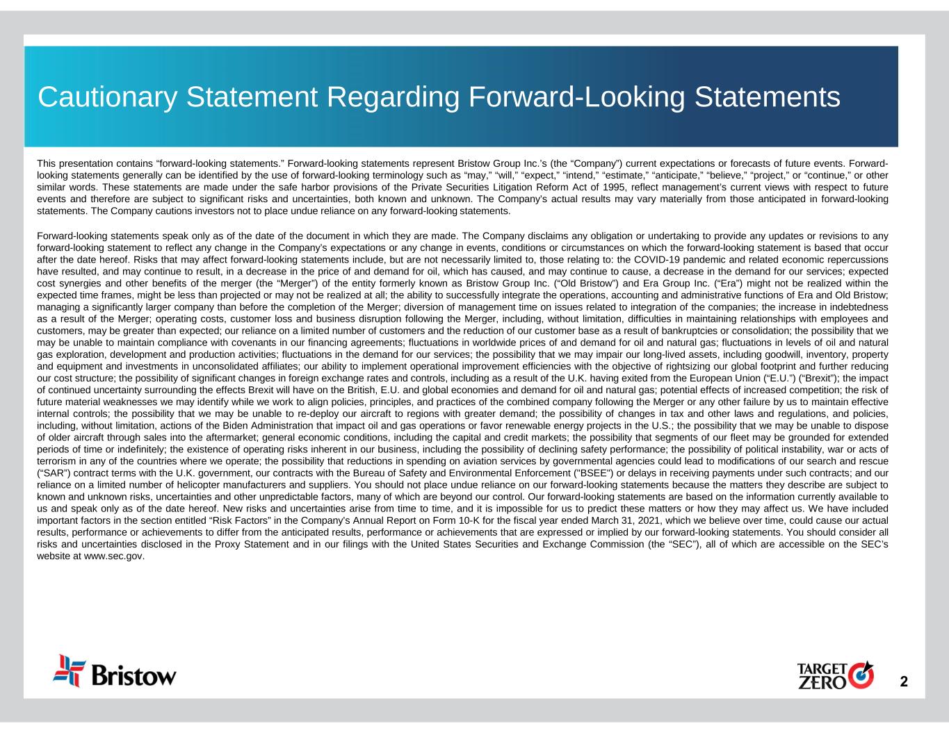 2 Cautionary Statement Regarding Forward-Looking Statements This presentation contains “forward-looking statements.” Forward-looking statements represent Bristow Group Inc.’s (the “Company”) current expectations or forecasts of future events. Forward- looking statements generally can be identified by the use of forward-looking terminology such as “may,” “will,” “expect,” “intend,” “estimate,” “anticipate,” “believe,” “project,” or “continue,” or other similar words. These statements are made under the safe harbor provisions of the Private Securities Litigation Reform Act of 1995, reflect management’s current views with respect to future events and therefore are subject to significant risks and uncertainties, both known and unknown. The Company’s actual results may vary materially from those anticipated in forward-looking statements. The Company cautions investors not to place undue reliance on any forward-looking statements. Forward-looking statements speak only as of the date of the document in which they are made. The Company disclaims any obligation or undertaking to provide any updates or revisions to any forward-looking statement to reflect any change in the Company’s expectations or any change in events, conditions or circumstances on which the forward-looking statement is based that occur after the date hereof. Risks that may affect forward-looking statements include, but are not necessarily limited to, those relating to: the COVID-19 pandemic and related economic repercussions have resulted, and may continue to result, in a decrease in the price of and demand for oil, which has caused, and may continue to cause, a decrease in the demand for our services; expected cost synergies and other benefits of the merger (the “Merger”) of the entity formerly known as Bristow Group Inc. (“Old Bristow”) and Era Group Inc. (“Era”) might not be realized within the expected time frames, might be less than projected or may not be realized at all; the ability to successfully integrate the operations, accounting and administrative functions of Era and Old Bristow; managing a significantly larger company than before the completion of the Merger; diversion of management time on issues related to integration of the companies; the increase in indebtedness as a result of the Merger; operating costs, customer loss and business disruption following the Merger, including, without limitation, difficulties in maintaining relationships with employees and customers, may be greater than expected; our reliance on a limited number of customers and the reduction of our customer base as a result of bankruptcies or consolidation; the possibility that we may be unable to maintain compliance with covenants in our financing agreements; fluctuations in worldwide prices of and demand for oil and natural gas; fluctuations in levels of oil and natural gas exploration, development and production activities; fluctuations in the demand for our services; the possibility that we may impair our long-lived assets, including goodwill, inventory, property and equipment and investments in unconsolidated affiliates; our ability to implement operational improvement efficiencies with the objective of rightsizing our global footprint and further reducing our cost structure; the possibility of significant changes in foreign exchange rates and controls, including as a result of the U.K. having exited from the European Union (“E.U.”) (“Brexit”); the impact of continued uncertainty surrounding the effects Brexit will have on the British, E.U. and global economies and demand for oil and natural gas; potential effects of increased competition; the risk of future material weaknesses we may identify while we work to align policies, principles, and practices of the combined company following the Merger or any other failure by us to maintain effective internal controls; the possibility that we may be unable to re-deploy our aircraft to regions with greater demand; the possibility of changes in tax and other laws and regulations, and policies, including, without limitation, actions of the Biden Administration that impact oil and gas operations or favor renewable energy projects in the U.S.; the possibility that we may be unable to dispose of older aircraft through sales into the aftermarket; general economic conditions, including the capital and credit markets; the possibility that segments of our fleet may be grounded for extended periods of time or indefinitely; the existence of operating risks inherent in our business, including the possibility of declining safety performance; the possibility of political instability, war or acts of terrorism in any of the countries where we operate; the possibility that reductions in spending on aviation services by governmental agencies could lead to modifications of our search and rescue (“SAR”) contract terms with the U.K. government, our contracts with the Bureau of Safety and Environmental Enforcement ("BSEE") or delays in receiving payments under such contracts; and our reliance on a limited number of helicopter manufacturers and suppliers. You should not place undue reliance on our forward-looking statements because the matters they describe are subject to known and unknown risks, uncertainties and other unpredictable factors, many of which are beyond our control. Our forward-looking statements are based on the information currently available to us and speak only as of the date hereof. New risks and uncertainties arise from time to time, and it is impossible for us to predict these matters or how they may affect us. We have included important factors in the section entitled “Risk Factors” in the Company’s Annual Report on Form 10-K for the fiscal year ended March 31, 2021, which we believe over time, could cause our actual results, performance or achievements to differ from the anticipated results, performance or achieveme