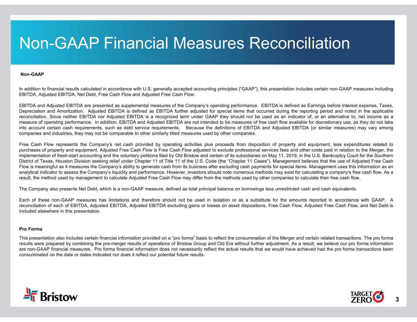 2 Cautionary Statement Regarding Forward-Looking Statements This presentation contains “forward-looking statements.” Forward-looking statements represent Bristow Group Inc.’s (the “Company”) current expectations or forecasts of future events. Forward- looking statements generally can be identified by the use of forward-looking terminology such as “may,” “will,” “expect,” “intend,” “estimate,” “anticipate,” “believe,” “project,” or “continue,” or other similar words. These statements are made under the safe harbor provisions of the Private Securities Litigation Reform Act of 1995, reflect management’s current views with respect to future events and therefore are subject to significant risks and uncertainties, both known and unknown. The Company’s actual results may vary materially from those anticipated in forward-looking statements. The Company cautions investors not to place undue reliance on any forward-looking statements. Forward-looking statements speak only as of the date of the document in which they are made. The Company disclaims any obligation or undertaking to provide any updates or revisions to any forward-looking statement to reflect any change in the Company’s expectations or any change in events, conditions or circumstances on which the forward-looking statement is based that occur after the date hereof. Risks that may affect forward-looking statements include, but are not necessarily limited to, those relating to: the COVID-19 pandemic and related economic repercussions have resulted, and may continue to result, in a decrease in the price of and demand for oil, which has caused, and may continue to cause, a decrease in the demand for our services; expected cost synergies and other benefits of the merger (the “Merger”) of the entity formerly known as Bristow Group Inc. (“Old Bristow”) and Era Group Inc. (“Era”) might not be realized within the expected time frames, might be less than projected or may not be realized at all; the ability to successfully integrate the operations, accounting and administrative functions of Era and Old Bristow; managing a significantly larger company than before the completion of the Merger; diversion of management time on issues related to integration of the companies; the increase in indebtedness as a result of the Merger; operating costs, customer loss and business disruption following the Merger, including, without limitation, difficulties in maintaining relationships with employees and customers, may be greater than expected; our reliance on a limited number of customers and the reduction of our customer base as a result of bankruptcies or consolidation; the possibility that we may be unable to maintain compliance with covenants in our financing agreements; fluctuations in worldwide prices of and demand for oil and natural gas; fluctuations in levels of oil and natural gas exploration, development and production activities; fluctuations in the demand for our services; the possibility that we may impair our long-lived assets, including goodwill, inventory, property and equipment and investments in unconsolidated affiliates; our ability to implement operational improvement efficiencies with the objective of rightsizing our global footprint and further reducing our cost structure; the possibility of significant changes in foreign exchange rates and controls, including as a result of the U.K. having exited from the European Union (“E.U.”) (“Brexit”); the impact of continued uncertainty surrounding the effects Brexit will have on the British, E.U. and global economies and demand for oil and natural gas; potential effects of increased competition; the risk of future material weaknesses we may identify while we work to align policies, principles, and practices of the combined company following the Merger or any other failure by us to maintain effective internal controls; the possibility that we may be unable to re-deploy our aircraft to regions with greater demand; the possibility of changes in tax and other laws and regulations, and policies, including, without limitation, actions of the Biden Administration that impact oil and gas operations or favor renewable energy projects in the U.S.; the possibility that we may be unable to dispose of older aircraft through sales into the aftermarket; general economic conditions, including the capital and credit markets; the possibility that segments of our fleet may be grounded for extended periods of time or indefinitely; the existence of operating risks inherent in our business, including the possibility of declining safety performance; the possibility of political instability, war or acts of terrorism in any of the countries where we operate; the possibility that reductions in spending on aviation services by governmental agencies could lead to modifications of our search and rescue (“SAR”) contract terms with the U.K. government, our contracts with the Bureau of Safety and Environmental Enforcement ("BSEE") or delays in receiving payments under such contracts; and our reliance on a limited number of helicopter manufacturers and suppliers. You should not place undue reliance on our forward-looking statements because the matters they describe are subject to known and unknown risks, uncertainties and other unpredictable factors, many of which are beyond our control. Our forward-looking statements are based on the information currently available to us and speak only as of the date hereof. New risks and uncertainties arise from time to time, and it is impossible for us to predict these matters or how they may affect us. We have included important factors in the section entitled “Risk Factors” in the Company’s Annual Report on Form 10-K for the fiscal year ended March 31, 2021, which we believe over time, could cause our actual results, performance or achievements to differ from the anticipated results, performance or achieveme