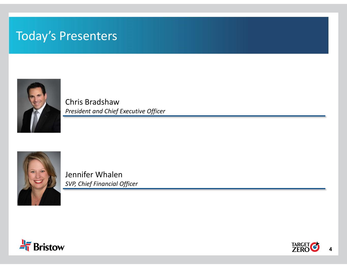 3 Non-GAAP In addition to financial results calculated in accordance with U.S. generally accepted accounting principles (“GAAP”), this presentation includes certain non-GAAP measures including EBITDA, Adjusted EBITDA, Net Debt, Free Cash Flow and Adjusted Free Cash Flow. EBITDA and Adjusted EBITDA are presented as supplemental measures of the Company’s operating performance. EBITDA is defined as Earnings before Interest expense, Taxes, Depreciation and Amortization. Adjusted EBITDA is defined as EBITDA further adjusted for special items that occurred during the reporting period and noted in the applicable reconciliation. Since neither EBITDA nor Adjusted EBITDA is a recognized term under GAAP they should not be used as an indicator of, or an alternative to, net income as a measure of operating performance. In addition, EBITDA and Adjusted EBITDA are not intended to be measures of free cash flow available for discretionary use, as they do not take into account certain cash requirements, such as debt service requirements. Because the definitions of EBITDA and Adjusted EBITDA (or similar measures) may vary among companies and industries, they may not be comparable to other similarly titled measures used by other companies. Free Cash Flow represents the Company’s net cash provided by operating activities plus proceeds from disposition of property and equipment, less expenditures related to purchases of property and equipment. Adjusted Free Cash Flow is Free Cash Flow adjusted to exclude professional services fees and other costs paid in relation to the Merger, the implementation of fresh-start accounting and the voluntary petitions filed by Old Bristow and certain of its subsidiaries on May 11, 2019, in the U.S. Bankruptcy Court for the Southern District of Texas, Houston Division seeking relief under Chapter 11 of Title 11 of the U.S. Code (the “Chapter 11 Cases”). Management believes that the use of Adjusted Free Cash Flow is meaningful as it measures the Company’s ability to generate cash from its business after excluding cash payments for special items. Management uses this information as an analytical indicator to assess the Company’s liquidity and performance. However, investors should note numerous methods may exist for calculating a company's free cash flow. As a result, the method used by management to calculate Adjusted Free Cash Flow may differ from the methods used by other companies to calculate their free cash flow. The Company also presents Net Debt, which is a non-GAAP measure, defined as total principal balance on borrowings less unrestricted cash and cash equivalents. Each of these non-GAAP measures has limitations and therefore should not be used in isolation or as a substitute for the amounts reported in accordance with GAAP. A reconciliation of each of EBITDA, Adjusted EBITDA, Adjusted EBITDA excluding gains or losses on asset dispositions, Free Cash Flow, Adjusted Free Cash Flow, and Net Debt is included elsewhere in this presentation. Pro Forma This presentation also includes certain financial information provided on a “pro forma” basis to reflect the consummation of the Merger and certain related transactions. The pro forma results were prepared by combining the pre-merger results of operations of Bristow Group and Old Era without further adjustment. As a result, we believe our pro forma information are non-GAAP financial measures. Pro forma financial information does not necessarily reflect the actual results that we would have achieved had the pro forma transactions been consummated on the date or dates indicated nor does it reflect our potential future results. Non-GAAP Financial Measures Reconciliation