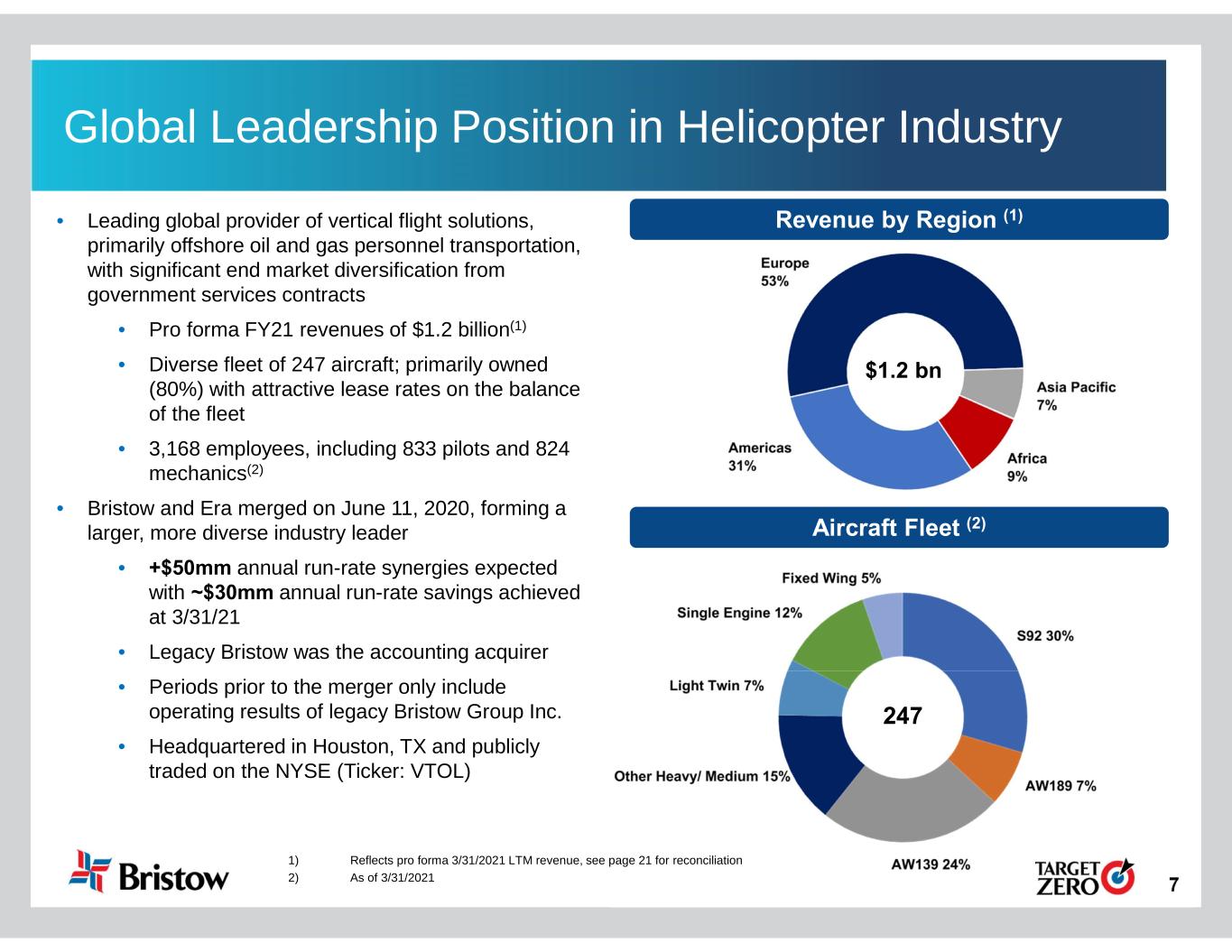 2 Cautionary Statement Regarding Forward-Looking Statements This presentation contains “forward-looking statements.” Forward-looking statements represent Bristow Group Inc.’s (the “Company”) current expectations or forecasts of future events. Forward- looking statements generally can be identified by the use of forward-looking terminology such as “may,” “will,” “expect,” “intend,” “estimate,” “anticipate,” “believe,” “project,” or “continue,” or other similar words. These statements are made under the safe harbor provisions of the Private Securities Litigation Reform Act of 1995, reflect management’s current views with respect to future events and therefore are subject to significant risks and uncertainties, both known and unknown. The Company’s actual results may vary materially from those anticipated in forward-looking statements. The Company cautions investors not to place undue reliance on any forward-looking statements. Forward-looking statements speak only as of the date of the document in which they are made. The Company disclaims any obligation or undertaking to provide any updates or revisions to any forward-looking statement to reflect any change in the Company’s expectations or any change in events, conditions or circumstances on which the forward-looking statement is based that occur after the date hereof. Risks that may affect forward-looking statements include, but are not necessarily limited to, those relating to: the COVID-19 pandemic and related economic repercussions have resulted, and may continue to result, in a decrease in the price of and demand for oil, which has caused, and may continue to cause, a decrease in the demand for our services; expected cost synergies and other benefits of the merger (the “Merger”) of the entity formerly known as Bristow Group Inc. (“Old Bristow”) and Era Group Inc. (“Era”) might not be realized within the expected time frames, might be less than projected or may not be realized at all; the ability to successfully integrate the operations, accounting and administrative functions of Era and Old Bristow; managing a significantly larger company than before the completion of the Merger; diversion of management time on issues related to integration of the companies; the increase in indebtedness as a result of the Merger; operating costs, customer loss and business disruption following the Merger, including, without limitation, difficulties in maintaining relationships with employees and customers, may be greater than expected; our reliance on a limited number of customers and the reduction of our customer base as a result of bankruptcies or consolidation; the possibility that we may be unable to maintain compliance with covenants in our financing agreements; fluctuations in worldwide prices of and demand for oil and natural gas; fluctuations in levels of oil and natural gas exploration, development and production activities; fluctuations in the demand for our services; the possibility that we may impair our long-lived assets, including goodwill, inventory, property and equipment and investments in unconsolidated affiliates; our ability to implement operational improvement efficiencies with the objective of rightsizing our global footprint and further reducing our cost structure; the possibility of significant changes in foreign exchange rates and controls, including as a result of the U.K. having exited from the European Union (“E.U.”) (“Brexit”); the impact of continued uncertainty surrounding the effects Brexit will have on the British, E.U. and global economies and demand for oil and natural gas; potential effects of increased competition; the risk of future material weaknesses we may identify while we work to align policies, principles, and practices of the combined company following the Merger or any other failure by us to maintain effective internal controls; the possibility that we may be unable to re-deploy our aircraft to regions with greater demand; the possibility of changes in tax and other laws and regulations, and policies, including, without limitation, actions of the Biden Administration that impact oil and gas operations or favor renewable energy projects in the U.S.; the possibility that we may be unable to dispose of older aircraft through sales into the aftermarket; general economic conditions, including the capital and credit markets; the possibility that segments of our fleet may be grounded for extended periods of time or indefinitely; the existence of operating risks inherent in our business, including the possibility of declining safety performance; the possibility of political instability, war or acts of terrorism in any of the countries where we operate; the possibility that reductions in spending on aviation services by governmental agencies could lead to modifications of our search and rescue (“SAR”) contract terms with the U.K. government, our contracts with the Bureau of Safety and Environmental Enforcement ("BSEE") or delays in receiving payments under such contracts; and our reliance on a limited number of helicopter manufacturers and suppliers. You should not place undue reliance on our forward-looking statements because the matters they describe are subject to known and unknown risks, uncertainties and other unpredictable factors, many of which are beyond our control. Our forward-looking statements are based on the information currently available to us and speak only as of the date hereof. New risks and uncertainties arise from time to time, and it is impossible for us to predict these matters or how they may affect us. We have included important factors in the section entitled “Risk Factors” in the Company’s Annual Report on Form 10-K for the fiscal year ended March 31, 2021, which we believe over time, could cause our actual results, performance or achievements to differ from the anticipated results, performance or achieveme