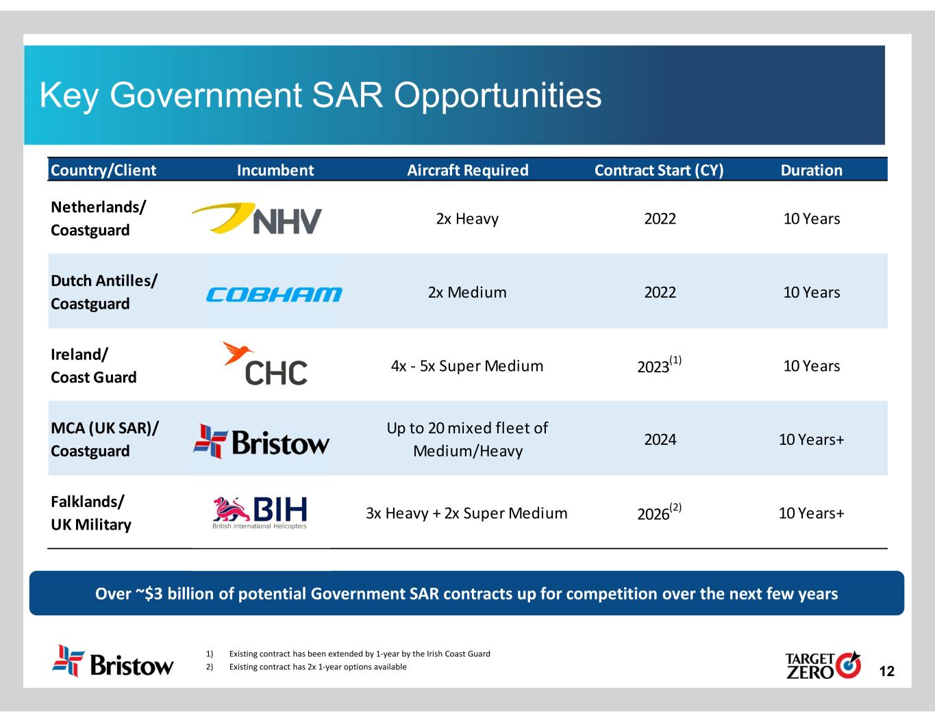 12 Key Government SAR Opportunities Country/Client Incumbent Aircraft Required Contract Start (CY) Duration Netherlands/ Coastguard 2x Heavy 2022 10 Years Dutch Antilles/ Coastguard 2x Medium 2022 10 Years Ireland/ Coast Guard 4x - 5x Super Medium 2023(1) 10 Years MCA (UK SAR)/ Coastguard Up to 20 mixed fleet of Medium/Heavy 2024 10 Years+ Falklands/ UK Military 3x Heavy + 2x Super Medium 2026(2) 10 Years+ 1) Existing contract has been extended by 1-year by the Irish Coast Guard 2) Existing contract has 2x 1-year options available Over ~$3 billion of potential Government SAR contracts up for competition over the next few years