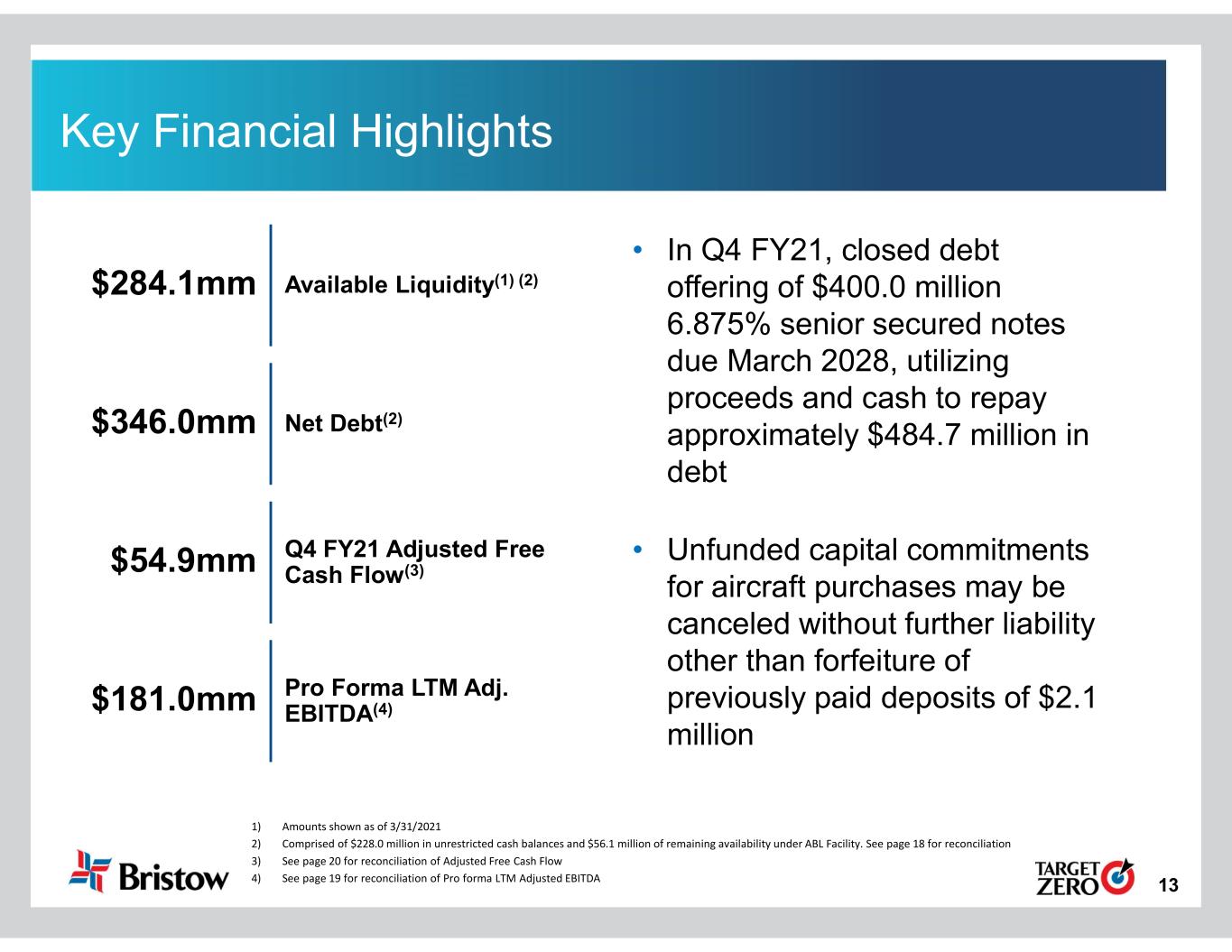 2 Cautionary Statement Regarding Forward-Looking Statements This presentation contains “forward-looking statements.” Forward-looking statements represent Bristow Group Inc.’s (the “Company”) current expectations or forecasts of future events. Forward- looking statements generally can be identified by the use of forward-looking terminology such as “may,” “will,” “expect,” “intend,” “estimate,” “anticipate,” “believe,” “project,” or “continue,” or other similar words. These statements are made under the safe harbor provisions of the Private Securities Litigation Reform Act of 1995, reflect management’s current views with respect to future events and therefore are subject to significant risks and uncertainties, both known and unknown. The Company’s actual results may vary materially from those anticipated in forward-looking statements. The Company cautions investors not to place undue reliance on any forward-looking statements. Forward-looking statements speak only as of the date of the document in which they are made. The Company disclaims any obligation or undertaking to provide any updates or revisions to any forward-looking statement to reflect any change in the Company’s expectations or any change in events, conditions or circumstances on which the forward-looking statement is based that occur after the date hereof. Risks that may affect forward-looking statements include, but are not necessarily limited to, those relating to: the COVID-19 pandemic and related economic repercussions have resulted, and may continue to result, in a decrease in the price of and demand for oil, which has caused, and may continue to cause, a decrease in the demand for our services; expected cost synergies and other benefits of the merger (the “Merger”) of the entity formerly known as Bristow Group Inc. (“Old Bristow”) and Era Group Inc. (“Era”) might not be realized within the expected time frames, might be less than projected or may not be realized at all; the ability to successfully integrate the operations, accounting and administrative functions of Era and Old Bristow; managing a significantly larger company than before the completion of the Merger; diversion of management time on issues related to integration of the companies; the increase in indebtedness as a result of the Merger; operating costs, customer loss and business disruption following the Merger, including, without limitation, difficulties in maintaining relationships with employees and customers, may be greater than expected; our reliance on a limited number of customers and the reduction of our customer base as a result of bankruptcies or consolidation; the possibility that we may be unable to maintain compliance with covenants in our financing agreements; fluctuations in worldwide prices of and demand for oil and natural gas; fluctuations in levels of oil and natural gas exploration, development and production activities; fluctuations in the demand for our services; the possibility that we may impair our long-lived assets, including goodwill, inventory, property and equipment and investments in unconsolidated affiliates; our ability to implement operational improvement efficiencies with the objective of rightsizing our global footprint and further reducing our cost structure; the possibility of significant changes in foreign exchange rates and controls, including as a result of the U.K. having exited from the European Union (“E.U.”) (“Brexit”); the impact of continued uncertainty surrounding the effects Brexit will have on the British, E.U. and global economies and demand for oil and natural gas; potential effects of increased competition; the risk of future material weaknesses we may identify while we work to align policies, principles, and practices of the combined company following the Merger or any other failure by us to maintain effective internal controls; the possibility that we may be unable to re-deploy our aircraft to regions with greater demand; the possibility of changes in tax and other laws and regulations, and policies, including, without limitation, actions of the Biden Administration that impact oil and gas operations or favor renewable energy projects in the U.S.; the possibility that we may be unable to dispose of older aircraft through sales into the aftermarket; general economic conditions, including the capital and credit markets; the possibility that segments of our fleet may be grounded for extended periods of time or indefinitely; the existence of operating risks inherent in our business, including the possibility of declining safety performance; the possibility of political instability, war or acts of terrorism in any of the countries where we operate; the possibility that reductions in spending on aviation services by governmental agencies could lead to modifications of our search and rescue (“SAR”) contract terms with the U.K. government, our contracts with the Bureau of Safety and Environmental Enforcement ("BSEE") or delays in receiving payments under such contracts; and our reliance on a limited number of helicopter manufacturers and suppliers. You should not place undue reliance on our forward-looking statements because the matters they describe are subject to known and unknown risks, uncertainties and other unpredictable factors, many of which are beyond our control. Our forward-looking statements are based on the information currently available to us and speak only as of the date hereof. New risks and uncertainties arise from time to time, and it is impossible for us to predict these matters or how they may affect us. We have included important factors in the section entitled “Risk Factors” in the Company’s Annual Report on Form 10-K for the fiscal year ended March 31, 2021, which we believe over time, could cause our actual results, performance or achievements to differ from the anticipated results, performance or achieveme