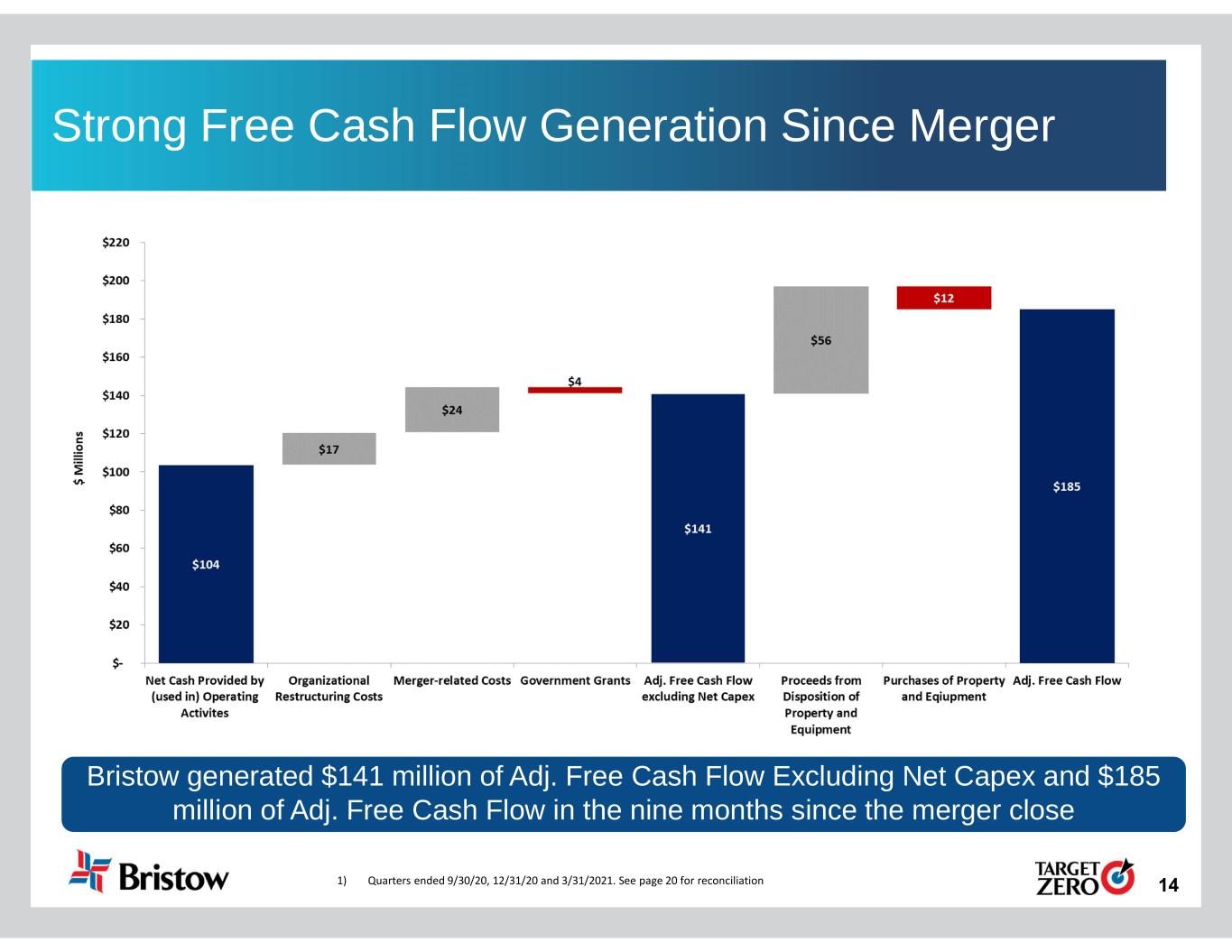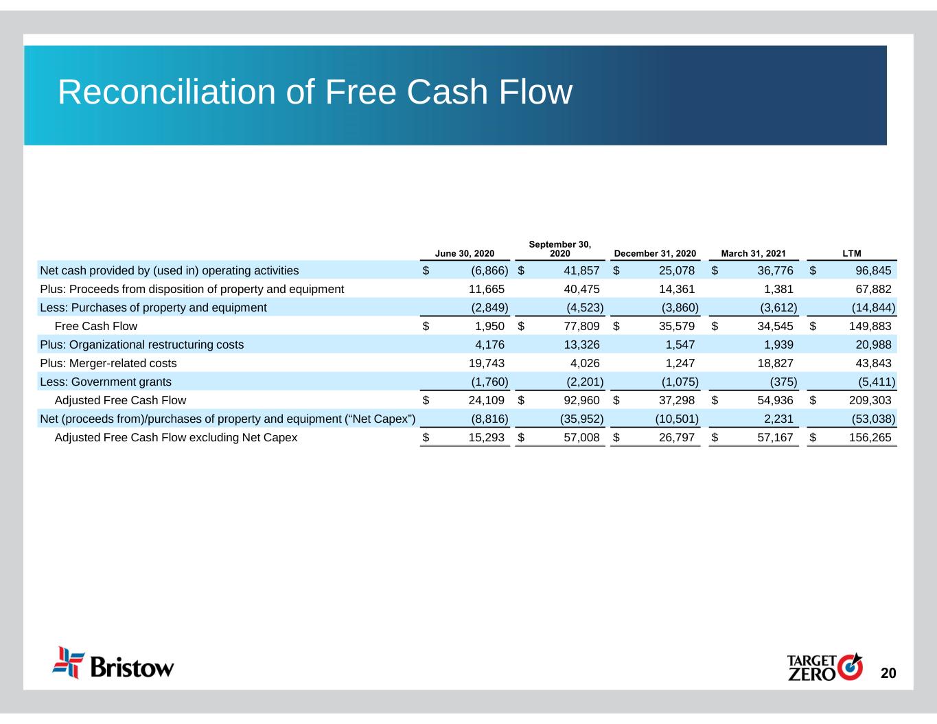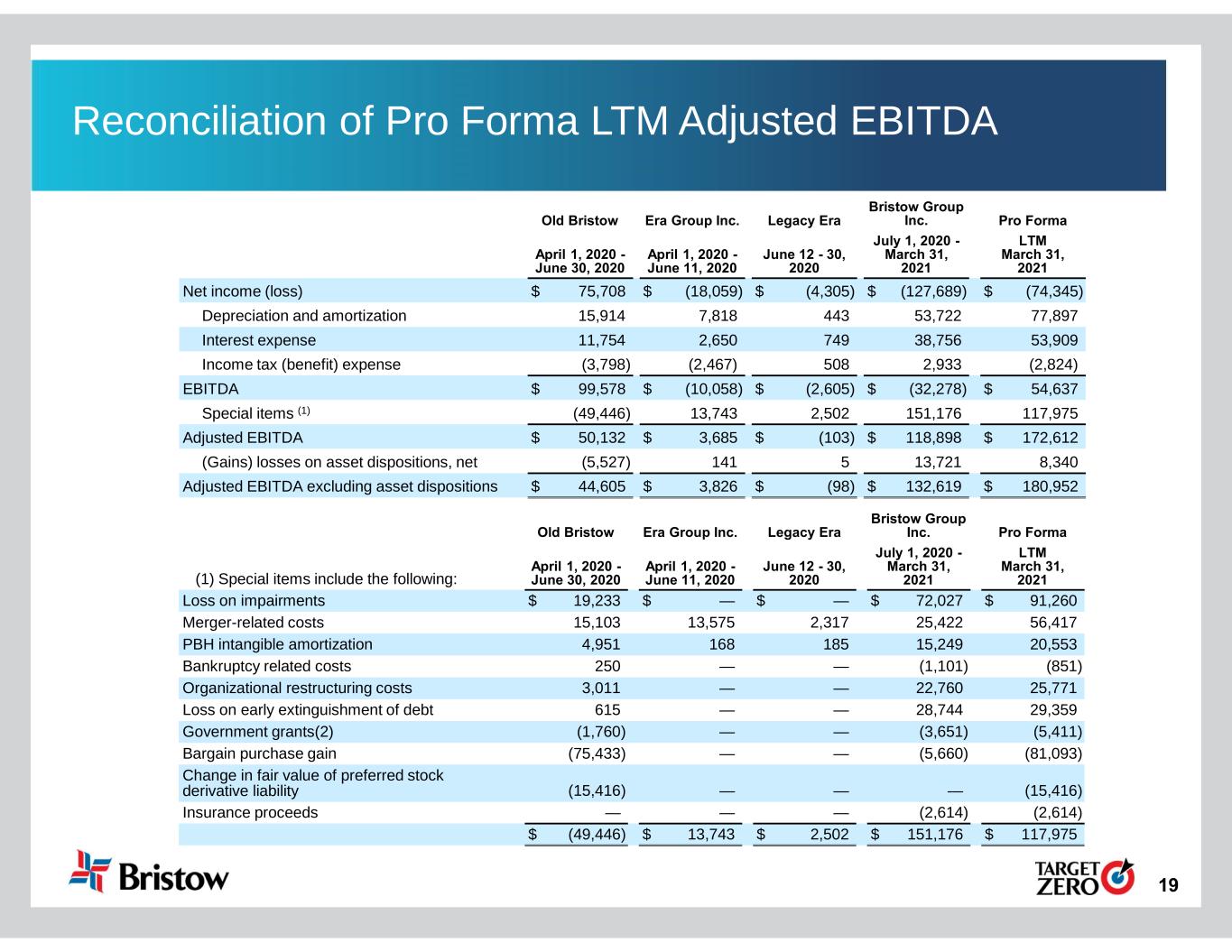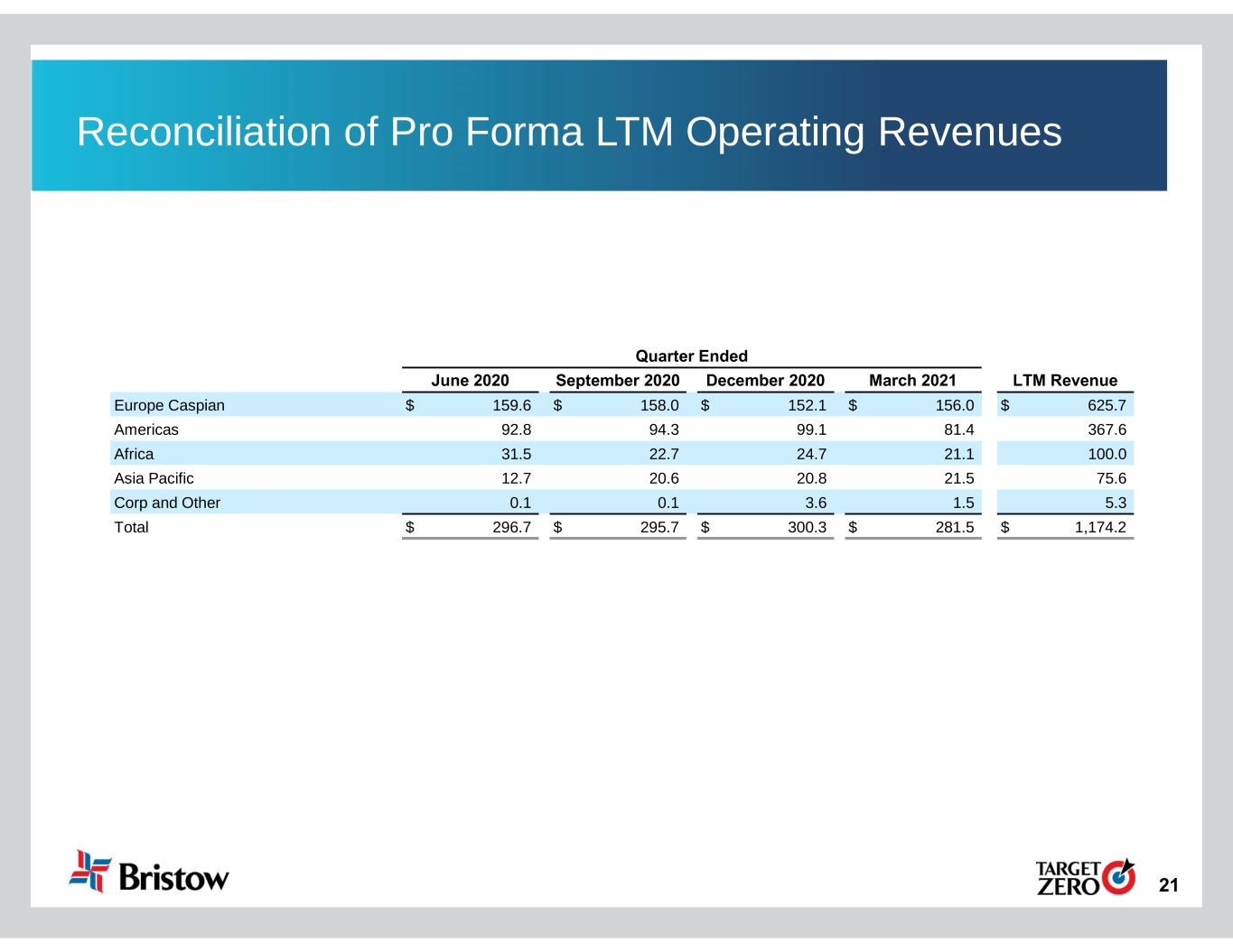 19 Reconciliation of Pro Forma LTM Adjusted EBITDA Old Bristow Era Group Inc. Legacy Era Bristow Group Inc. Pro Forma April 1, 2020 - June 30, 2020 April 1, 2020 - June 11, 2020 June 12 - 30, 2020 July 1, 2020 - March 31, 2021 LTM March 31, 2021 Net income (loss) $ 75,708 $ (18,059) $ (4,305) $ (127,689) $ (74,345) Depreciation and amortization 15,914 7,818 443 53,722 77,897 Interest expense 11,754 2,650 749 38,756 53,909 Income tax (benefit) expense (3,798) (2,467) 508 2,933 (2,824) EBITDA $ 99,578 $ (10,058) $ (2,605) $ (32,278) $ 54,637 Special items (1) (49,446) 13,743 2,502 151,176 117,975 Adjusted EBITDA $ 50,132 $ 3,685 $ (103) $ 118,898 $ 172,612 (Gains) losses on asset dispositions, net (5,527) 141 5 13,721 8,340 Adjusted EBITDA excluding asset dispositions $ 44,605 $ 3,826 $ (98) $ 132,619 $ 180,952 Old Bristow Era Group Inc. Legacy Era Bristow Group Inc. Pro Forma (1) Special items include the following: April 1, 2020 - June 30, 2020 April 1, 2020 - June 11, 2020 June 12 - 30, 2020 July 1, 2020 - March 31, 2021 LTM March 31, 2021 Loss on impairments $ 19,233 $ — $ — $ 72,027 $ 91,260 Merger-related costs 15,103 13,575 2,317 25,422 56,417 PBH intangible amortization 4,951 168 185 15,249 20,553 Bankruptcy related costs 250 — — (1,101) (851) Organizational restructuring costs 3,011 — — 22,760 25,771 Loss on early extinguishment of debt 615 — — 28,744 29,359 Government grants(2) (1,760) — — (3,651) (5,411) Bargain purchase gain (75,433) — — (5,660) (81,093) Change in fair value of preferred stock derivative liability (15,416) — — — (15,416) Insurance proceeds — — — (2,614) (2,614) $ (49,446) $ 13,743 $ 2,502 $ 151,176 $ 117,975