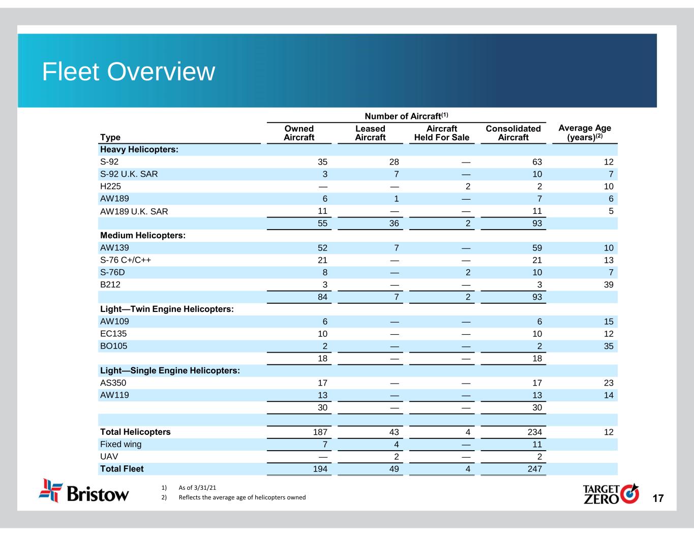 17 Fleet Overview Number of Aircraft(1) Type Owned Aircraft Leased Aircraft Aircraft Held For Sale Consolidated Aircraft Average Age (years)(2) Heavy Helicopters: S-92 35 28 — 63 12 S-92 U.K. SAR 3 7 — 10 7 H225 — — 2 2 10 AW189 6 1 — 7 6 AW189 U.K. SAR 11 — — 11 5 55 36 2 93 Medium Helicopters: AW139 52 7 — 59 10 S-76 C+/C++ 21 — — 21 13 S-76D 8 — 2 10 7 B212 3 — — 3 39 84 7 2 93 Light—Twin Engine Helicopters: AW109 6 — — 6 15 EC135 10 — — 10 12 BO105 2 — — 2 35 18 — — 18 Light—Single Engine Helicopters: AS350 17 — — 17 23 AW119 13 — — 13 14 30 — — 30 Total Helicopters 187 43 4 234 12 Fixed wing 7 4 — 11 UAV — 2 — 2 Total Fleet 194 49 4 247 1) As of 3/31/21 2) Reflects the average age of helicopters owned