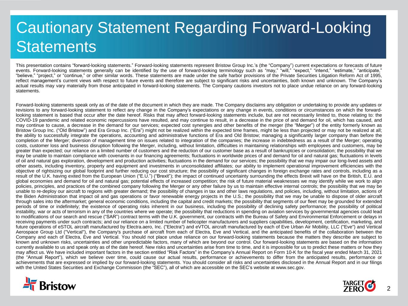 2 Cautionary Statement Regarding Forward-Looking Statements This presentation contains “forward-looking statements.” Forward-looking statements represent Bristow Group Inc.’s (the “Company”) current expectations or forecasts of future events. Forward-looking statements generally can be identified by the use of forward-looking terminology such as “may,” “will,” “expect,” “intend,” “estimate,” “anticipate,” “believe,” “project,” or “continue,” or other similar words. These statements are made under the safe harbor provisions of the Private Securities Litigation Reform Act of 1995, reflect management’s current views with respect to future events and therefore are subject to significant risks and uncertainties, both known and unknown. The Company’s actual results may vary materially from those anticipated in forward-looking statements. The Company cautions investors not to place undue reliance on any forward-looking statements. Forward-looking statements speak only as of the date of the document in which they are made. The Company disclaims any obligation or undertaking to provide any updates or revisions to any forward-looking statement to reflect any change in the Company’s expectations or any change in events, conditions or circumstances on which the forward- looking statement is based that occur after the date hereof. Risks that may affect forward-looking statements include, but are not necessarily limited to, those relating to: the COVID-19 pandemic and related economic repercussions have resulted, and may continue to result, in a decrease in the price of and demand for oil, which has caused, and may continue to cause, a decrease in the demand for our services; expected cost synergies and other benefits of the merger (the “Merger”) of the entity formerly known as Bristow Group Inc. (“Old Bristow”) and Era Group Inc. (“Era”) might not be realized within the expected time frames, might be less than projected or may not be realized at all; the ability to successfully integrate the operations, accounting and administrative functions of Era and Old Bristow; managing a significantly larger company than before the completion of the Merger; diversion of management time on issues related to integration of the companies; the increase in indebtedness as a result of the Merger; operating costs, customer loss and business disruption following the Merger, including, without limitation, difficulties in maintaining relationships with employees and customers, may be greater than expected; our reliance on a limited number of customers and the reduction of our customer base as a result of bankruptcies or consolidation; the possibility that we may be unable to maintain compliance with covenants in our financing agreements; fluctuations in worldwide prices of and demand for oil and natural gas; fluctuations in levels of oil and natural gas exploration, development and production activities; fluctuations in the demand for our services; the possibility that we may impair our long-lived assets and other assets, including inventory, property and equipment and investments in unconsolidated affiliates; our ability to implement operational improvement efficiencies with the objective of rightsizing our global footprint and further reducing our cost structure; the possibility of significant changes in foreign exchange rates and controls, including as a result of the U.K. having exited from the European Union (“E.U.”) (“Brexit”); the impact of continued uncertainty surrounding the effects Brexit will have on the British, E.U. and global economies and demand for oil and natural gas; potential effects of increased competition; the risk of future material weaknesses we may identify while we work to align policies, principles, and practices of the combined company following the Merger or any other failure by us to maintain effective internal controls; the possibility that we may be unable to re-deploy our aircraft to regions with greater demand; the possibility of changes in tax and other laws regulations, and policies, including, without limitation, actions of the Biden Administration that impact oil and gas operations or favor renewable energy projects in the U.S.; the possibility that we may be unable to dispose of older aircraft through sales into the aftermarket; general economic conditions, including the capital and credit markets; the possibility that segments of our fleet may be grounded for extended periods of time or indefinitely; the existence of operating risks inherent in our business, including the possibility of declining safety performance; the possibility of political instability, war or acts of terrorism in any of the countries where we operate; the possibility that reductions in spending on aviation services by governmental agencies could lead to modifications of our search and rescue (“SAR”) contract terms with the U.K. government, our contracts with the Bureau of Safety and Environmental Enforcement or delays in receiving payments under such contracts; and our reliance on a limited number of helicopter manufacturers and suppliers capabilities, development, certification, marketing, and future operations of eSTOL aircraft manufactured by Electra.aero, Inc. ("Electra") and eVTOL aircraft manufactured by each of Eve Urban Air Mobility, LLC ("Eve") and Vertical Aerospace Group Ltd ("Vertical"), the Company's purchase of aircraft from each of Electra, Eve and Vertical, and the anticipated benefits of the collaboration between the Company and each of Electra, Eve and Vertical. You should not place undue reliance on our forward-looking statements because the matters they describe are subject to known and unknown risks, uncertainties and other unpredictable factors, many of which are beyond our control. Our forward-looking statements are based on the information currently available to us and speak only as of the date hereof. New risk