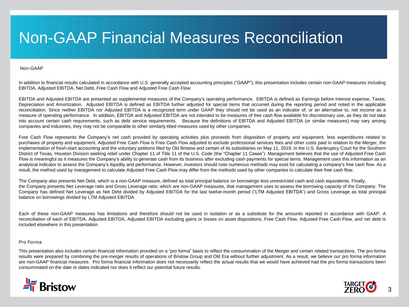 2 Cautionary Statement Regarding Forward-Looking Statements This presentation contains “forward-looking statements.” Forward-looking statements represent Bristow Group Inc.’s (the “Company”) current expectations or forecasts of future events. Forward-looking statements generally can be identified by the use of forward-looking terminology such as “may,” “will,” “expect,” “intend,” “estimate,” “anticipate,” “believe,” “project,” or “continue,” or other similar words. These statements are made under the safe harbor provisions of the Private Securities Litigation Reform Act of 1995, reflect management’s current views with respect to future events and therefore are subject to significant risks and uncertainties, both known and unknown. The Company’s actual results may vary materially from those anticipated in forward-looking statements. The Company cautions investors not to place undue reliance on any forward-looking statements. Forward-looking statements speak only as of the date of the document in which they are made. The Company disclaims any obligation or undertaking to provide any updates or revisions to any forward-looking statement to reflect any change in the Company’s expectations or any change in events, conditions or circumstances on which the forward- looking statement is based that occur after the date hereof. Risks that may affect forward-looking statements include, but are not necessarily limited to, those relating to: the COVID-19 pandemic and related economic repercussions have resulted, and may continue to result, in a decrease in the price of and demand for oil, which has caused, and may continue to cause, a decrease in the demand for our services; expected cost synergies and other benefits of the merger (the “Merger”) of the entity formerly known as Bristow Group Inc. (“Old Bristow”) and Era Group Inc. (“Era”) might not be realized within the expected time frames, might be less than projected or may not be realized at all; the ability to successfully integrate the operations, accounting and administrative functions of Era and Old Bristow; managing a significantly larger company than before the completion of the Merger; diversion of management time on issues related to integration of the companies; the increase in indebtedness as a result of the Merger; operating costs, customer loss and business disruption following the Merger, including, without limitation, difficulties in maintaining relationships with employees and customers, may be greater than expected; our reliance on a limited number of customers and the reduction of our customer base as a result of bankruptcies or consolidation; the possibility that we may be unable to maintain compliance with covenants in our financing agreements; fluctuations in worldwide prices of and demand for oil and natural gas; fluctuations in levels of oil and natural gas exploration, development and production activities; fluctuations in the demand for our services; the possibility that we may impair our long-lived assets and other assets, including inventory, property and equipment and investments in unconsolidated affiliates; our ability to implement operational improvement efficiencies with the objective of rightsizing our global footprint and further reducing our cost structure; the possibility of significant changes in foreign exchange rates and controls, including as a result of the U.K. having exited from the European Union (“E.U.”) (“Brexit”); the impact of continued uncertainty surrounding the effects Brexit will have on the British, E.U. and global economies and demand for oil and natural gas; potential effects of increased competition; the risk of future material weaknesses we may identify while we work to align policies, principles, and practices of the combined company following the Merger or any other failure by us to maintain effective internal controls; the possibility that we may be unable to re-deploy our aircraft to regions with greater demand; the possibility of changes in tax and other laws regulations, and policies, including, without limitation, actions of the Biden Administration that impact oil and gas operations or favor renewable energy projects in the U.S.; the possibility that we may be unable to dispose of older aircraft through sales into the aftermarket; general economic conditions, including the capital and credit markets; the possibility that segments of our fleet may be grounded for extended periods of time or indefinitely; the existence of operating risks inherent in our business, including the possibility of declining safety performance; the possibility of political instability, war or acts of terrorism in any of the countries where we operate; the possibility that reductions in spending on aviation services by governmental agencies could lead to modifications of our search and rescue (“SAR”) contract terms with the U.K. government, our contracts with the Bureau of Safety and Environmental Enforcement or delays in receiving payments under such contracts; and our reliance on a limited number of helicopter manufacturers and suppliers capabilities, development, certification, marketing, and future operations of eSTOL aircraft manufactured by Electra.aero, Inc. ("Electra") and eVTOL aircraft manufactured by each of Eve Urban Air Mobility, LLC ("Eve") and Vertical Aerospace Group Ltd ("Vertical"), the Company's purchase of aircraft from each of Electra, Eve and Vertical, and the anticipated benefits of the collaboration between the Company and each of Electra, Eve and Vertical. You should not place undue reliance on our forward-looking statements because the matters they describe are subject to known and unknown risks, uncertainties and other unpredictable factors, many of which are beyond our control. Our forward-looking statements are based on the information currently available to us and speak only as of the date hereof. New risk