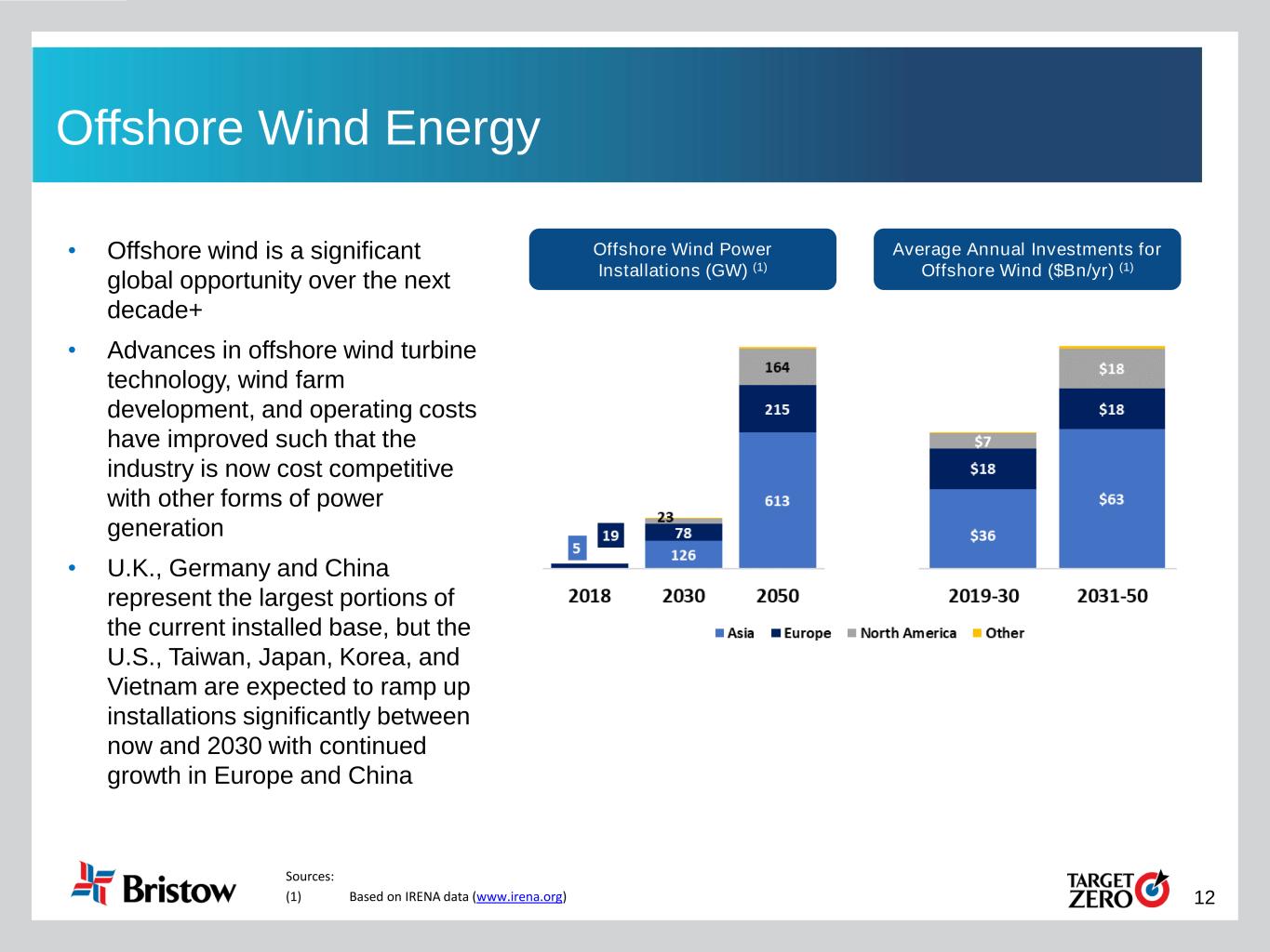12 Offshore Wind Energy • Offshore wind is a significant global opportunity over the next decade+ • Advances in offshore wind turbine technology, wind farm development, and operating costs have improved such that the industry is now cost competitive with other forms of power generation • U.K., Germany and China represent the largest portions of the current installed base, but the U.S., Taiwan, Japan, Korea, and Vietnam are expected to ramp up installations significantly between now and 2030 with continued growth in Europe and China Sources: (1) Based on IRENA data (www.irena.org) Offshore Wind Power Installations (GW) (1) Average Annual Investments for Offshore Wind ($Bn/yr) (1)