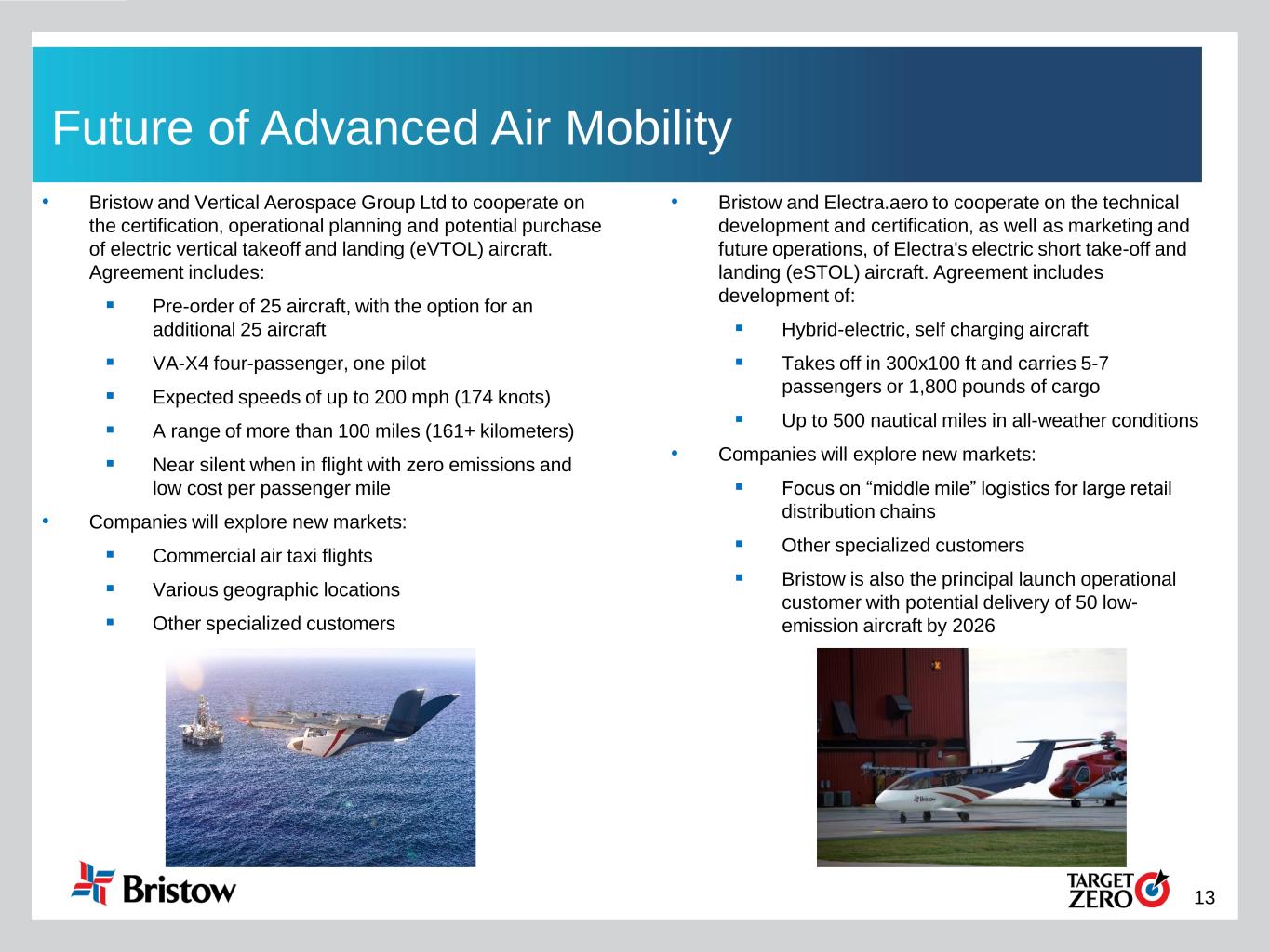 2 Cautionary Statement Regarding Forward-Looking Statements This presentation contains “forward-looking statements.” Forward-looking statements represent Bristow Group Inc.’s (the “Company”) current expectations or forecasts of future events. Forward-looking statements generally can be identified by the use of forward-looking terminology such as “may,” “will,” “expect,” “intend,” “estimate,” “anticipate,” “believe,” “project,” or “continue,” or other similar words. These statements are made under the safe harbor provisions of the Private Securities Litigation Reform Act of 1995, reflect management’s current views with respect to future events and therefore are subject to significant risks and uncertainties, both known and unknown. The Company’s actual results may vary materially from those anticipated in forward-looking statements. The Company cautions investors not to place undue reliance on any forward-looking statements. Forward-looking statements speak only as of the date of the document in which they are made. The Company disclaims any obligation or undertaking to provide any updates or revisions to any forward-looking statement to reflect any change in the Company’s expectations or any change in events, conditions or circumstances on which the forward- looking statement is based that occur after the date hereof. Risks that may affect forward-looking statements include, but are not necessarily limited to, those relating to: the COVID-19 pandemic and related economic repercussions have resulted, and may continue to result, in a decrease in the price of and demand for oil, which has caused, and may continue to cause, a decrease in the demand for our services; expected cost synergies and other benefits of the merger (the “Merger”) of the entity formerly known as Bristow Group Inc. (“Old Bristow”) and Era Group Inc. (“Era”) might not be realized within the expected time frames, might be less than projected or may not be realized at all; the ability to successfully integrate the operations, accounting and administrative functions of Era and Old Bristow; managing a significantly larger company than before the completion of the Merger; diversion of management time on issues related to integration of the companies; the increase in indebtedness as a result of the Merger; operating costs, customer loss and business disruption following the Merger, including, without limitation, difficulties in maintaining relationships with employees and customers, may be greater than expected; our reliance on a limited number of customers and the reduction of our customer base as a result of bankruptcies or consolidation; the possibility that we may be unable to maintain compliance with covenants in our financing agreements; fluctuations in worldwide prices of and demand for oil and natural gas; fluctuations in levels of oil and natural gas exploration, development and production activities; fluctuations in the demand for our services; the possibility that we may impair our long-lived assets and other assets, including inventory, property and equipment and investments in unconsolidated affiliates; our ability to implement operational improvement efficiencies with the objective of rightsizing our global footprint and further reducing our cost structure; the possibility of significant changes in foreign exchange rates and controls, including as a result of the U.K. having exited from the European Union (“E.U.”) (“Brexit”); the impact of continued uncertainty surrounding the effects Brexit will have on the British, E.U. and global economies and demand for oil and natural gas; potential effects of increased competition; the risk of future material weaknesses we may identify while we work to align policies, principles, and practices of the combined company following the Merger or any other failure by us to maintain effective internal controls; the possibility that we may be unable to re-deploy our aircraft to regions with greater demand; the possibility of changes in tax and other laws regulations, and policies, including, without limitation, actions of the Biden Administration that impact oil and gas operations or favor renewable energy projects in the U.S.; the possibility that we may be unable to dispose of older aircraft through sales into the aftermarket; general economic conditions, including the capital and credit markets; the possibility that segments of our fleet may be grounded for extended periods of time or indefinitely; the existence of operating risks inherent in our business, including the possibility of declining safety performance; the possibility of political instability, war or acts of terrorism in any of the countries where we operate; the possibility that reductions in spending on aviation services by governmental agencies could lead to modifications of our search and rescue (“SAR”) contract terms with the U.K. government, our contracts with the Bureau of Safety and Environmental Enforcement or delays in receiving payments under such contracts; and our reliance on a limited number of helicopter manufacturers and suppliers capabilities, development, certification, marketing, and future operations of eSTOL aircraft manufactured by Electra.aero, Inc. ("Electra") and eVTOL aircraft manufactured by each of Eve Urban Air Mobility, LLC ("Eve") and Vertical Aerospace Group Ltd ("Vertical"), the Company's purchase of aircraft from each of Electra, Eve and Vertical, and the anticipated benefits of the collaboration between the Company and each of Electra, Eve and Vertical. You should not place undue reliance on our forward-looking statements because the matters they describe are subject to known and unknown risks, uncertainties and other unpredictable factors, many of which are beyond our control. Our forward-looking statements are based on the information currently available to us and speak only as of the date hereof. New risk