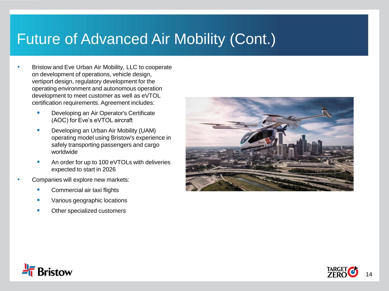 13 Future of Advanced Air Mobility • Bristow and Vertical Aerospace Group Ltd to cooperate on the certification, operational planning and potential purchase of electric vertical takeoff and landing (eVTOL) aircraft. Agreement includes: ▪ Pre-order of 25 aircraft, with the option for an additional 25 aircraft ▪ VA-X4 four-passenger, one pilot ▪ Expected speeds of up to 200 mph (174 knots) ▪ A range of more than 100 miles (161+ kilometers) ▪ Near silent when in flight with zero emissions and low cost per passenger mile • Companies will explore new markets: ▪ Commercial air taxi flights ▪ Various geographic locations ▪ Other specialized customers • Bristow and Electra.aero to cooperate on the technical development and certification, as well as marketing and future operations, of Electra's electric short take-off and landing (eSTOL) aircraft. Agreement includes development of: ▪ Hybrid-electric, self charging aircraft ▪ Takes off in 300x100 ft and carries 5-7 passengers or 1,800 pounds of cargo ▪ Up to 500 nautical miles in all-weather conditions • Companies will explore new markets: ▪ Focus on “middle mile” logistics for large retail distribution chains ▪ Other specialized customers ▪ Bristow is also the principal launch operational customer with potential delivery of 50 low- emission aircraft by 2026
