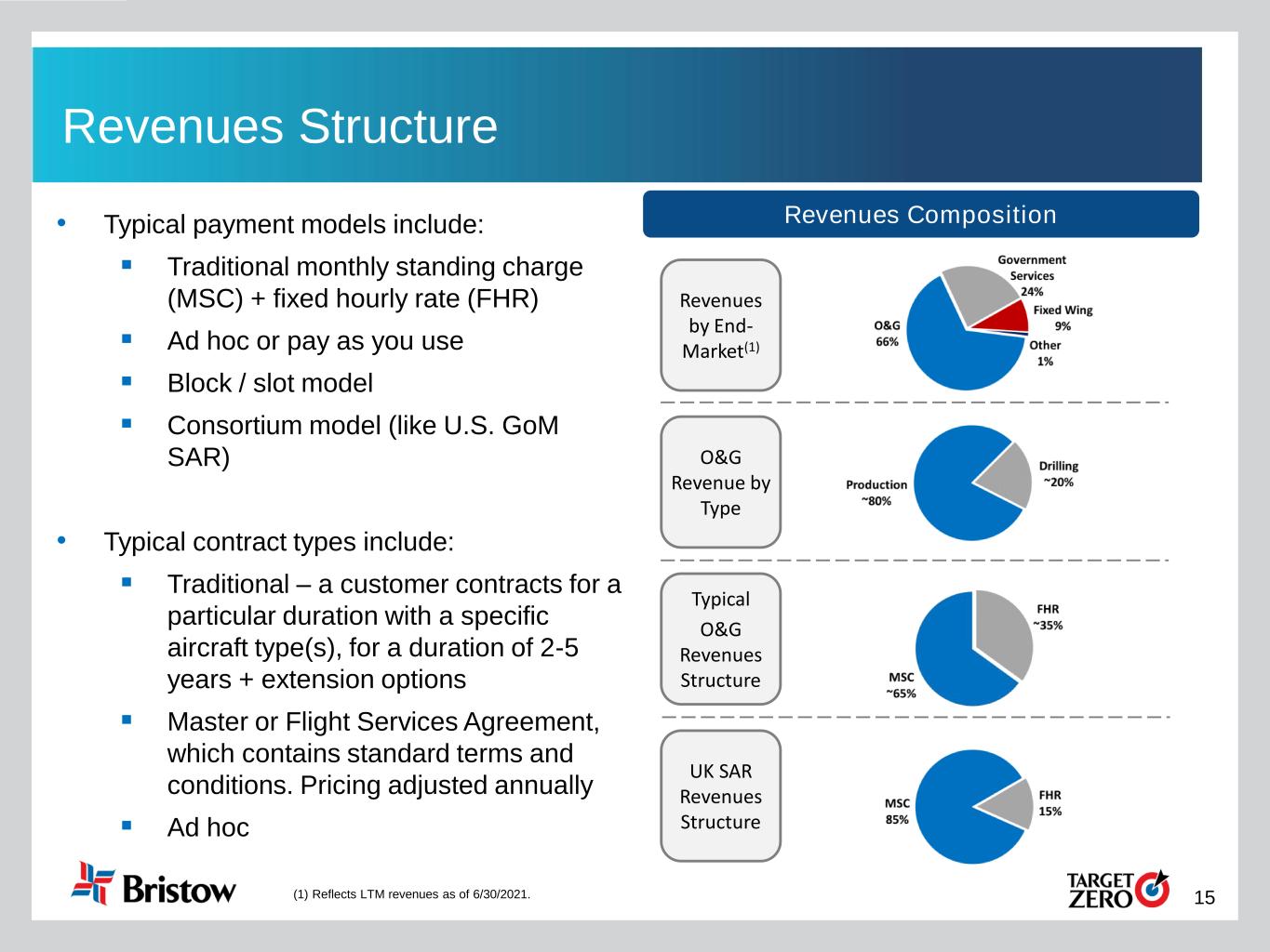 14 Future of Advanced Air Mobility (Cont.) • Bristow and Eve Urban Air Mobility, LLC to cooperate on development of operations, vehicle design, vertiport design, regulatory development for the operating environment and autonomous operation development to meet customer as well as eVTOL certification requirements. Agreement includes: ▪ Developing an Air Operator's Certificate (AOC) for Eve’s eVTOL aircraft ▪ Developing an Urban Air Mobility (UAM) operating model using Bristow's experience in safely transporting passengers and cargo worldwide ▪ An order for up to 100 eVTOLs with deliveries expected to start in 2026 • Companies will explore new markets: ▪ Commercial air taxi flights ▪ Various geographic locations ▪ Other specialized customers