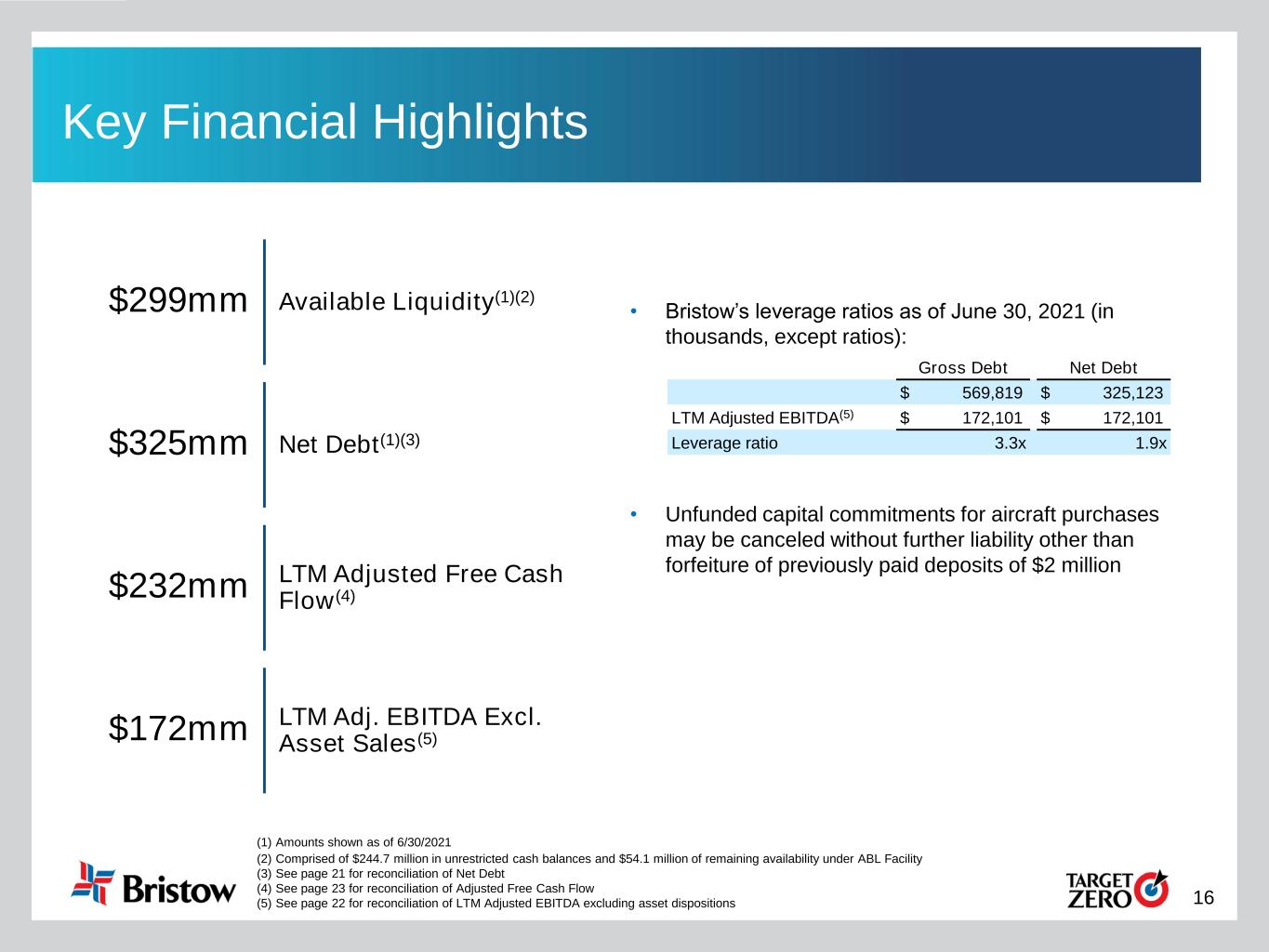 2 Cautionary Statement Regarding Forward-Looking Statements This presentation contains “forward-looking statements.” Forward-looking statements represent Bristow Group Inc.’s (the “Company”) current expectations or forecasts of future events. Forward-looking statements generally can be identified by the use of forward-looking terminology such as “may,” “will,” “expect,” “intend,” “estimate,” “anticipate,” “believe,” “project,” or “continue,” or other similar words. These statements are made under the safe harbor provisions of the Private Securities Litigation Reform Act of 1995, reflect management’s current views with respect to future events and therefore are subject to significant risks and uncertainties, both known and unknown. The Company’s actual results may vary materially from those anticipated in forward-looking statements. The Company cautions investors not to place undue reliance on any forward-looking statements. Forward-looking statements speak only as of the date of the document in which they are made. The Company disclaims any obligation or undertaking to provide any updates or revisions to any forward-looking statement to reflect any change in the Company’s expectations or any change in events, conditions or circumstances on which the forward- looking statement is based that occur after the date hereof. Risks that may affect forward-looking statements include, but are not necessarily limited to, those relating to: the COVID-19 pandemic and related economic repercussions have resulted, and may continue to result, in a decrease in the price of and demand for oil, which has caused, and may continue to cause, a decrease in the demand for our services; expected cost synergies and other benefits of the merger (the “Merger”) of the entity formerly known as Bristow Group Inc. (“Old Bristow”) and Era Group Inc. (“Era”) might not be realized within the expected time frames, might be less than projected or may not be realized at all; the ability to successfully integrate the operations, accounting and administrative functions of Era and Old Bristow; managing a significantly larger company than before the completion of the Merger; diversion of management time on issues related to integration of the companies; the increase in indebtedness as a result of the Merger; operating costs, customer loss and business disruption following the Merger, including, without limitation, difficulties in maintaining relationships with employees and customers, may be greater than expected; our reliance on a limited number of customers and the reduction of our customer base as a result of bankruptcies or consolidation; the possibility that we may be unable to maintain compliance with covenants in our financing agreements; fluctuations in worldwide prices of and demand for oil and natural gas; fluctuations in levels of oil and natural gas exploration, development and production activities; fluctuations in the demand for our services; the possibility that we may impair our long-lived assets and other assets, including inventory, property and equipment and investments in unconsolidated affiliates; our ability to implement operational improvement efficiencies with the objective of rightsizing our global footprint and further reducing our cost structure; the possibility of significant changes in foreign exchange rates and controls, including as a result of the U.K. having exited from the European Union (“E.U.”) (“Brexit”); the impact of continued uncertainty surrounding the effects Brexit will have on the British, E.U. and global economies and demand for oil and natural gas; potential effects of increased competition; the risk of future material weaknesses we may identify while we work to align policies, principles, and practices of the combined company following the Merger or any other failure by us to maintain effective internal controls; the possibility that we may be unable to re-deploy our aircraft to regions with greater demand; the possibility of changes in tax and other laws regulations, and policies, including, without limitation, actions of the Biden Administration that impact oil and gas operations or favor renewable energy projects in the U.S.; the possibility that we may be unable to dispose of older aircraft through sales into the aftermarket; general economic conditions, including the capital and credit markets; the possibility that segments of our fleet may be grounded for extended periods of time or indefinitely; the existence of operating risks inherent in our business, including the possibility of declining safety performance; the possibility of political instability, war or acts of terrorism in any of the countries where we operate; the possibility that reductions in spending on aviation services by governmental agencies could lead to modifications of our search and rescue (“SAR”) contract terms with the U.K. government, our contracts with the Bureau of Safety and Environmental Enforcement or delays in receiving payments under such contracts; and our reliance on a limited number of helicopter manufacturers and suppliers capabilities, development, certification, marketing, and future operations of eSTOL aircraft manufactured by Electra.aero, Inc. ("Electra") and eVTOL aircraft manufactured by each of Eve Urban Air Mobility, LLC ("Eve") and Vertical Aerospace Group Ltd ("Vertical"), the Company's purchase of aircraft from each of Electra, Eve and Vertical, and the anticipated benefits of the collaboration between the Company and each of Electra, Eve and Vertical. You should not place undue reliance on our forward-looking statements because the matters they describe are subject to known and unknown risks, uncertainties and other unpredictable factors, many of which are beyond our control. Our forward-looking statements are based on the information currently available to us and speak only as of the date hereof. New risk