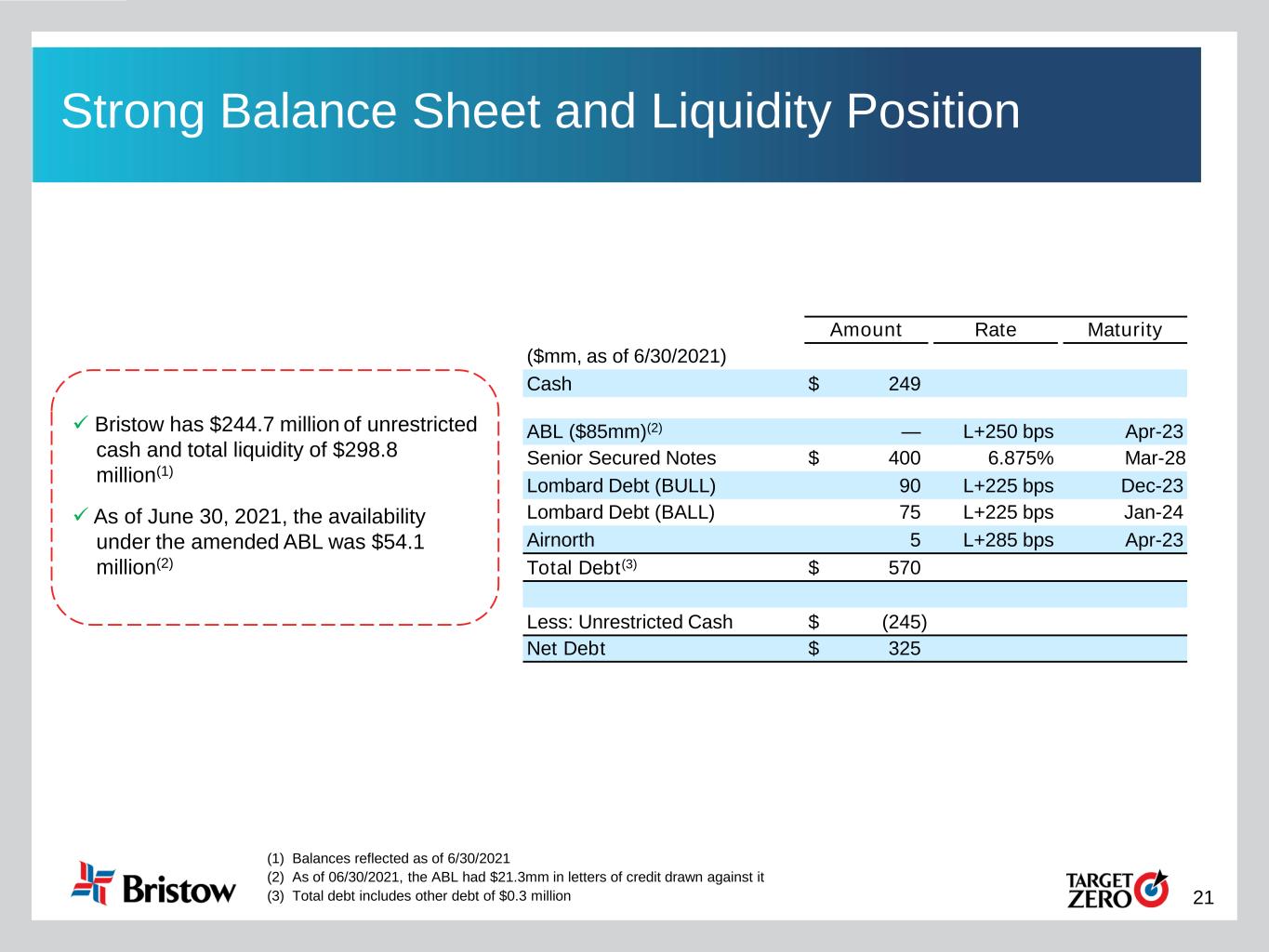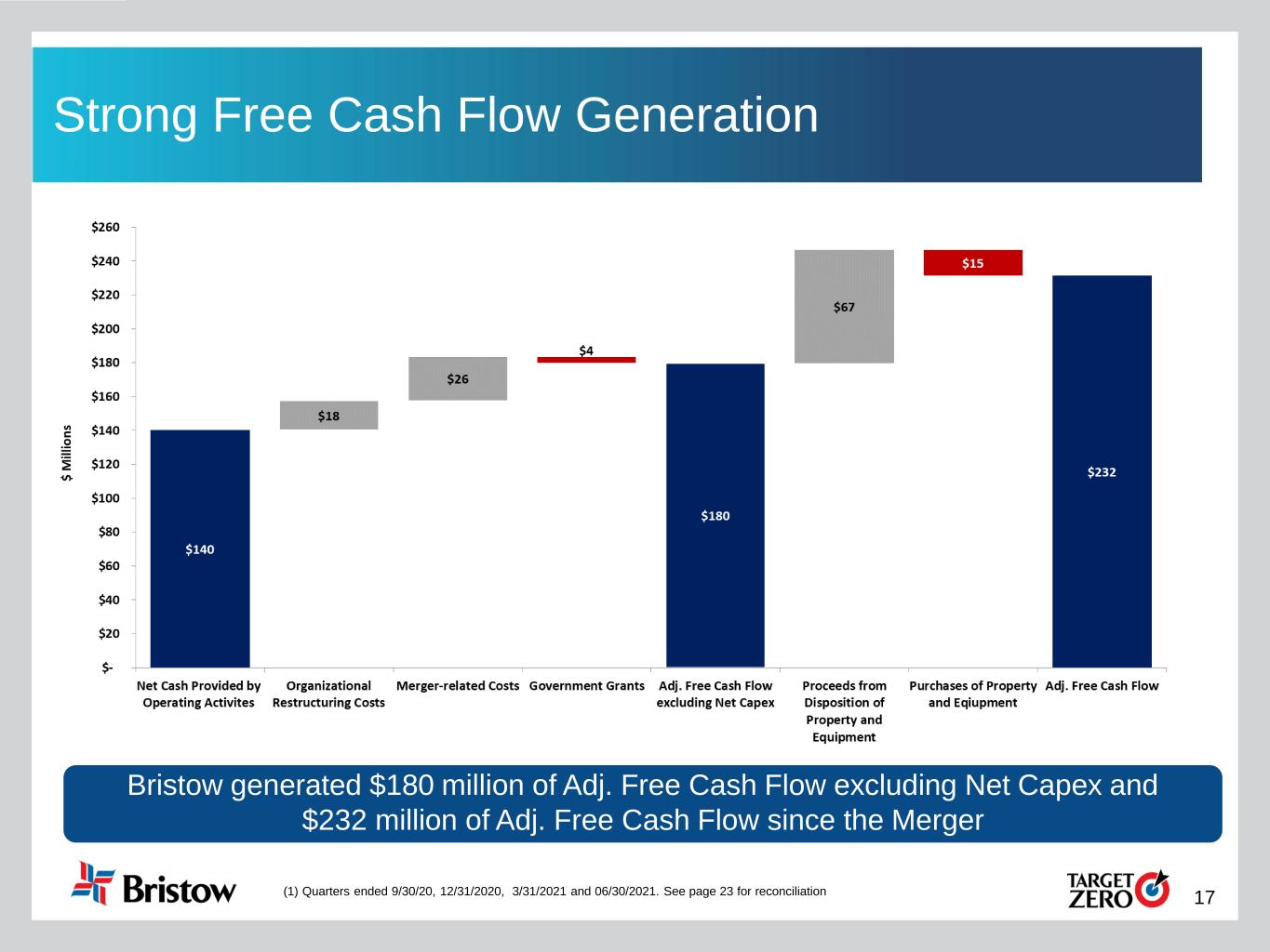 16 • Bristow’s leverage ratios as of June 30, 2021 (in thousands, except ratios): Key Financial Highlights (1) Amounts shown as of 6/30/2021 (2) Comprised of $244.7 million in unrestricted cash balances and $54.1 million of remaining availability under ABL Facility (3) See page 21 for reconciliation of Net Debt (4) See page 23 for reconciliation of Adjusted Free Cash Flow (5) See page 22 for reconciliation of LTM Adjusted EBITDA excluding asset dispositions $299mm Available Liquidity(1)(2) $325mm Net Debt(1)(3) $232mm LTM Adjusted Free Cash Flow(4) $172mm LTM Adj. EBITDA Excl. Asset Sales(5) • Unfunded capital commitments for aircraft purchases may be canceled without further liability other than forfeiture of previously paid deposits of $2 million Gross Debt Net Debt $ 569,819 $ 325,123 LTM Adjusted EBITDA(5) $ 172,101 $ 172,101 Leverage ratio 3.3x 1.9x