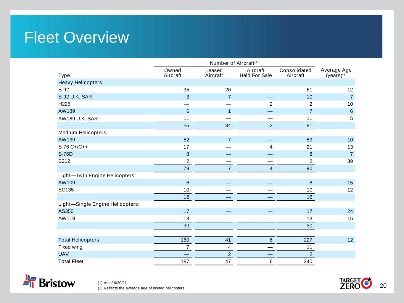 20 Fleet Overview Number of Aircraft(1) Type Owned Aircraft Leased Aircraft Aircraft Held For Sale Consolidated Aircraft Average Age (years)(2) Heavy Helicopters: S-92 35 26 — 61 12 S-92 U.K. SAR 3 7 — 10 7 H225 — — 2 2 10 AW189 6 1 — 7 6 AW189 U.K. SAR 11 — — 11 5 55 34 2 91 Medium Helicopters: AW139 52 7 — 59 10 S-76 C+/C++ 17 — 4 21 13 S-76D 8 — — 8 7 B212 2 — — 2 39 79 7 4 90 Light—Twin Engine Helicopters: AW109 6 — — 6 15 EC135 10 — — 10 12 16 — — 16 Light—Single Engine Helicopters: AS350 17 — — 17 24 AW119 13 — — 13 15 30 — — 30 Total Helicopters 180 41 6 227 12 Fixed wing 7 4 — 11 UAV — 2 — 2 Total Fleet 187 47 6 240 (1) As of 6/30/21 (2) Reflects the average age of owned helicopters