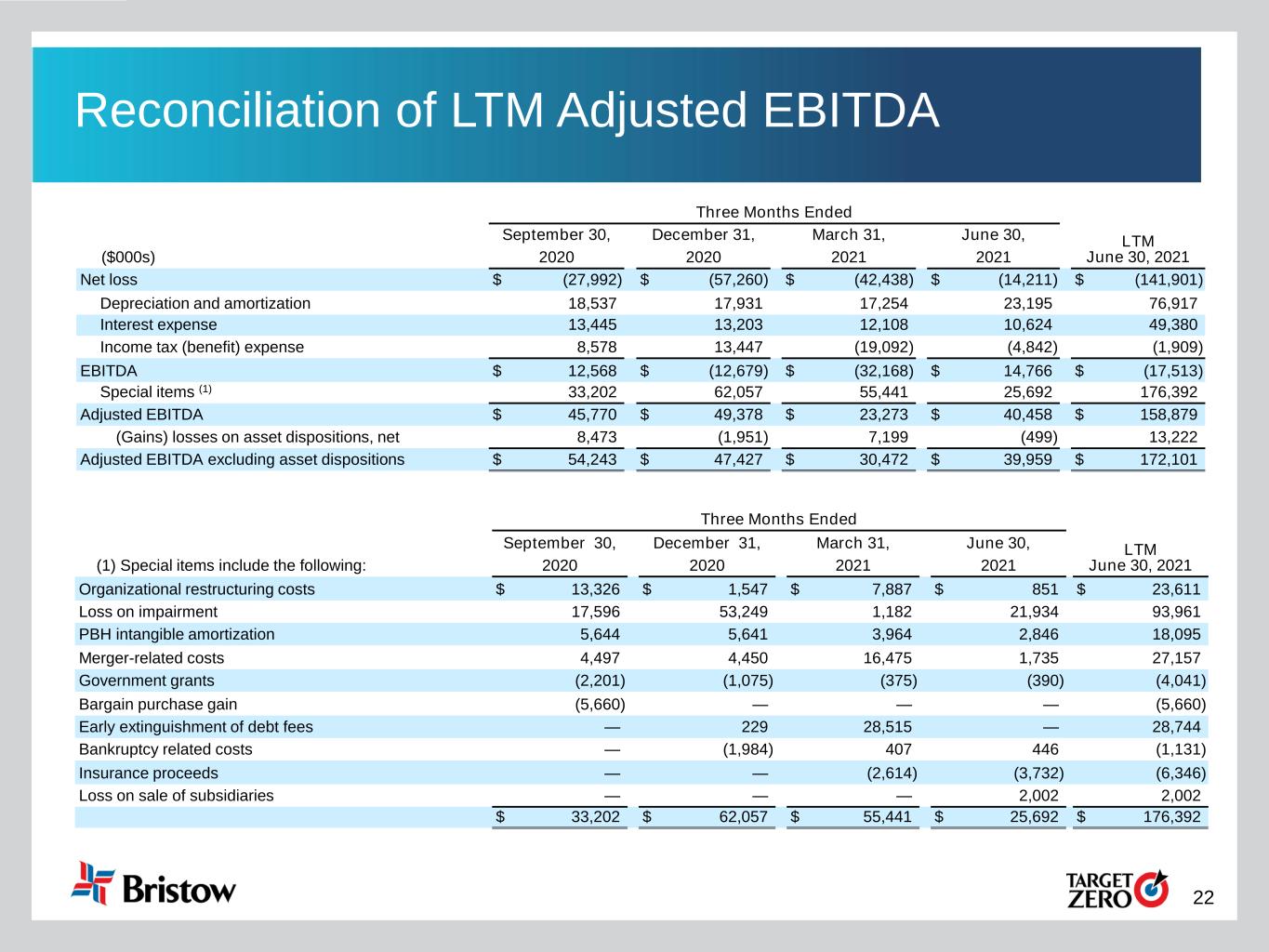 22 Reconciliation of LTM Adjusted EBITDA Three Months Ended LTM June 30, 2021 September 30, December 31, March 31, June 30, ($000s) 2020 2020 2021 2021 Net loss $ (27,992) $ (57,260) $ (42,438) $ (14,211) $ (141,901) Depreciation and amortization 18,537 17,931 17,254 23,195 76,917 Interest expense 13,445 13,203 12,108 10,624 49,380 Income tax (benefit) expense 8,578 13,447 (19,092) (4,842) (1,909) EBITDA $ 12,568 $ (12,679) $ (32,168) $ 14,766 $ (17,513) Special items (1) 33,202 62,057 55,441 25,692 176,392 Adjusted EBITDA $ 45,770 $ 49,378 $ 23,273 $ 40,458 $ 158,879 (Gains) losses on asset dispositions, net 8,473 (1,951) 7,199 (499) 13,222 Adjusted EBITDA excluding asset dispositions $ 54,243 $ 47,427 $ 30,472 $ 39,959 $ 172,101 Three Months Ended LTM June 30, 2021 September 30, December 31, March 31, June 30, (1) Special items include the following: 2020 2020 2021 2021 Organizational restructuring costs $ 13,326 $ 1,547 $ 7,887 $ 851 $ 23,611 Loss on impairment 17,596 53,249 1,182 21,934 93,961 PBH intangible amortization 5,644 5,641 3,964 2,846 18,095 Merger-related costs 4,497 4,450 16,475 1,735 27,157 Government grants (2,201) (1,075) (375) (390) (4,041) Bargain purchase gain (5,660) — — — (5,660) Early extinguishment of debt fees — 229 28,515 — 28,744 Bankruptcy related costs — (1,984) 407 446 (1,131) Insurance proceeds — — (2,614) (3,732) (6,346) Loss on sale of subsidiaries — — — 2,002 2,002 $ 33,202 $ 62,057 $ 55,441 $ 25,692 $ 176,392