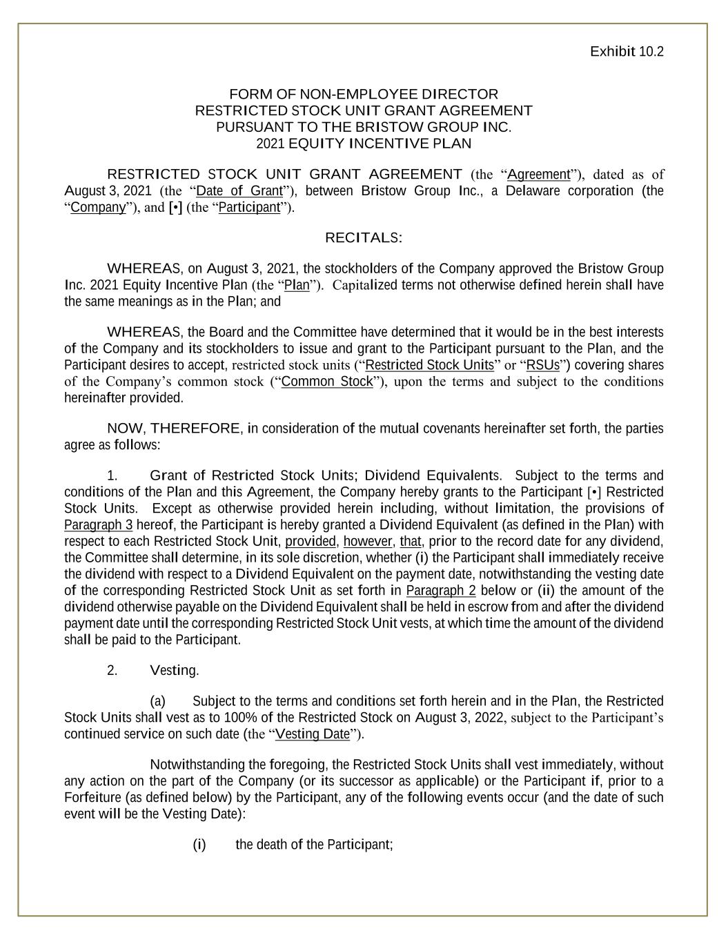 Exhibit 10.2 FORM OF NON-EMPLOYEE DIRECTOR RESTRICTED STOCK UNIT GRANT AGREEMENT PURSUANT TO THE BRISTOW GROUP INC. 2021 EQUITY INCENTIVE PLAN RESTRICTED STOCK UNIT GRANT AGREEMENT (the “Agreement”), dated as of August 3, 2021 (the “Date of Grant”), between Bristow Group Inc., a Delaware corporation (the “Company”), and [•] (the “Participant”). RECITALS: WHEREAS, on August 3, 2021, the stockholders of the Company approved the Bristow Group Inc. 2021 Equity Incentive Plan (the “Plan”). Capitalized terms not otherwise defined herein shall have the same meanings as in the Plan; and WHEREAS, the Board and the Committee have determined that it would be in the best interests of the Company and its stockholders to issue and grant to the Participant pursuant to the Plan, and the Participant desires to accept, restricted stock units (“Restricted Stock Units” or “RSUs”) covering shares of the Company’s common stock (“Common Stock”), upon the terms and subject to the conditions hereinafter provided. NOW, THEREFORE, in consideration of the mutual covenants hereinafter set forth, the parties agree as follows: 1. Grant of Restricted Stock Units; Dividend Equivalents. Subject to the terms and conditions of the Plan and this Agreement, the Company hereby grants to the Participant [•] Restricted Stock Units. Except as otherwise provided herein including, without limitation, the provisions of Paragraph 3 hereof, the Participant is hereby granted a Dividend Equivalent (as defined in the Plan) with respect to each Restricted Stock Unit, provided, however, that, prior to the record date for any dividend, the Committee shall determine, in its sole discretion, whether (i) the Participant shall immediately receive the dividend with respect to a Dividend Equivalent on the payment date, notwithstanding the vesting date of the corresponding Restricted Stock Unit as set forth in Paragraph 2 below or (ii) the amount of the dividend otherwise payable on the Dividend Equivalent shall be held in escrow from and after the dividend payment date until the corresponding Restricted Stock Unit vests, at which time the amount of the dividend shall be paid to the Participant. 2. Vesting. (a) Subject to the terms and conditions set forth herein and in the Plan, the Restricted Stock Units shall vest as to 100% of the Restricted Stock on August 3, 2022, subject to the Participant’s continued service on such date (the “Vesting Date”). Notwithstanding the foregoing, the Restricted Stock Units shall vest immediately, without any action on the part of the Company (or its successor as applicable) or the Participant if, prior to a Forfeiture (as defined below) by the Participant, any of the following events occur (and the date of such event will be the Vesting Date): (i) the death of the Participant;