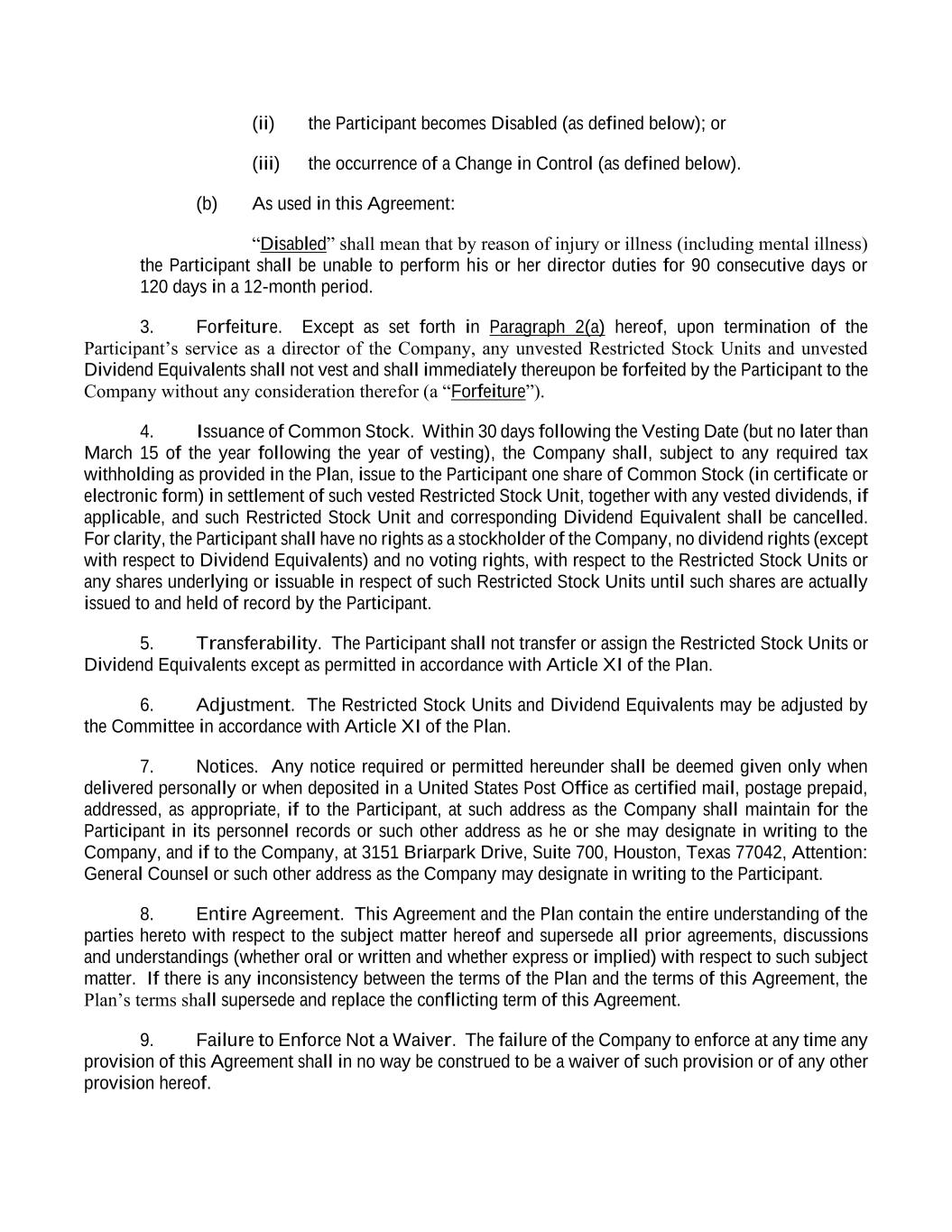 (ii) the Participant becomes Disabled (as defined below); or (iii) the occurrence of a Change in Control (as defined below). (b) As used in this Agreement: “Disabled” shall mean that by reason of injury or illness (including mental illness) the Participant shall be unable to perform his or her director duties for 90 consecutive days or 120 days in a 12-month period. 3. Forfeiture. Except as set forth in Paragraph 2(a) hereof, upon termination of the Participant’s service as a director of the Company, any unvested Restricted Stock Units and unvested Dividend Equivalents shall not vest and shall immediately thereupon be forfeited by the Participant to the Company without any consideration therefor (a “Forfeiture”). 4. Issuance of Common Stock. Within 30 days following the Vesting Date (but no later than March 15 of the year following the year of vesting), the Company shall, subject to any required tax withholding as provided in the Plan, issue to the Participant one share of Common Stock (in certificate or electronic form) in settlement of such vested Restricted Stock Unit, together with any vested dividends, if applicable, and such Restricted Stock Unit and corresponding Dividend Equivalent shall be cancelled. For clarity, the Participant shall have no rights as a stockholder of the Company, no dividend rights (except with respect to Dividend Equivalents) and no voting rights, with respect to the Restricted Stock Units or any shares underlying or issuable in respect of such Restricted Stock Units until such shares are actually issued to and held of record by the Participant. 5. Transferability. The Participant shall not transfer or assign the Restricted Stock Units or Dividend Equivalents except as permitted in accordance with Article XI of the Plan. 6. Adjustment. The Restricted Stock Units and Dividend Equivalents may be adjusted by the Committee in accordance with Article XI of the Plan. 7. Notices. Any notice required or permitted hereunder shall be deemed given only when delivered personally or when deposited in a United States Post Office as certified mail, postage prepaid, addressed, as appropriate, if to the Participant, at such address as the Company shall maintain for the Participant in its personnel records or such other address as he or she may designate in writing to the Company, and if to the Company, at 3151 Briarpark Drive, Suite 700, Houston, Texas 77042, Attention: General Counsel or such other address as the Company may designate in writing to the Participant. 8. Entire Agreement. This Agreement and the Plan contain the entire understanding of the parties hereto with respect to the subject matter hereof and supersede all prior agreements, discussions and understandings (whether oral or written and whether express or implied) with respect to such subject matter. If there is any inconsistency between the terms of the Plan and the terms of this Agreement, the Plan’s terms shall supersede and replace the conflicting term of this Agreement. 9. Failure to Enforce Not a Waiver. The failure of the Company to enforce at any time any provision of this Agreement shall in no way be construed to be a waiver of such provision or of any other provision hereof.